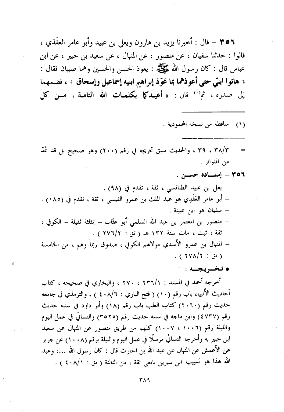 قالوا: حدثنا سفيان. عن منصور. عن المنهال. عن سعيد بن جبير. عن ابن عباس قال: [كان رسول الله ص: يعوذ الحسن والحسين وهما صبيان فقال: