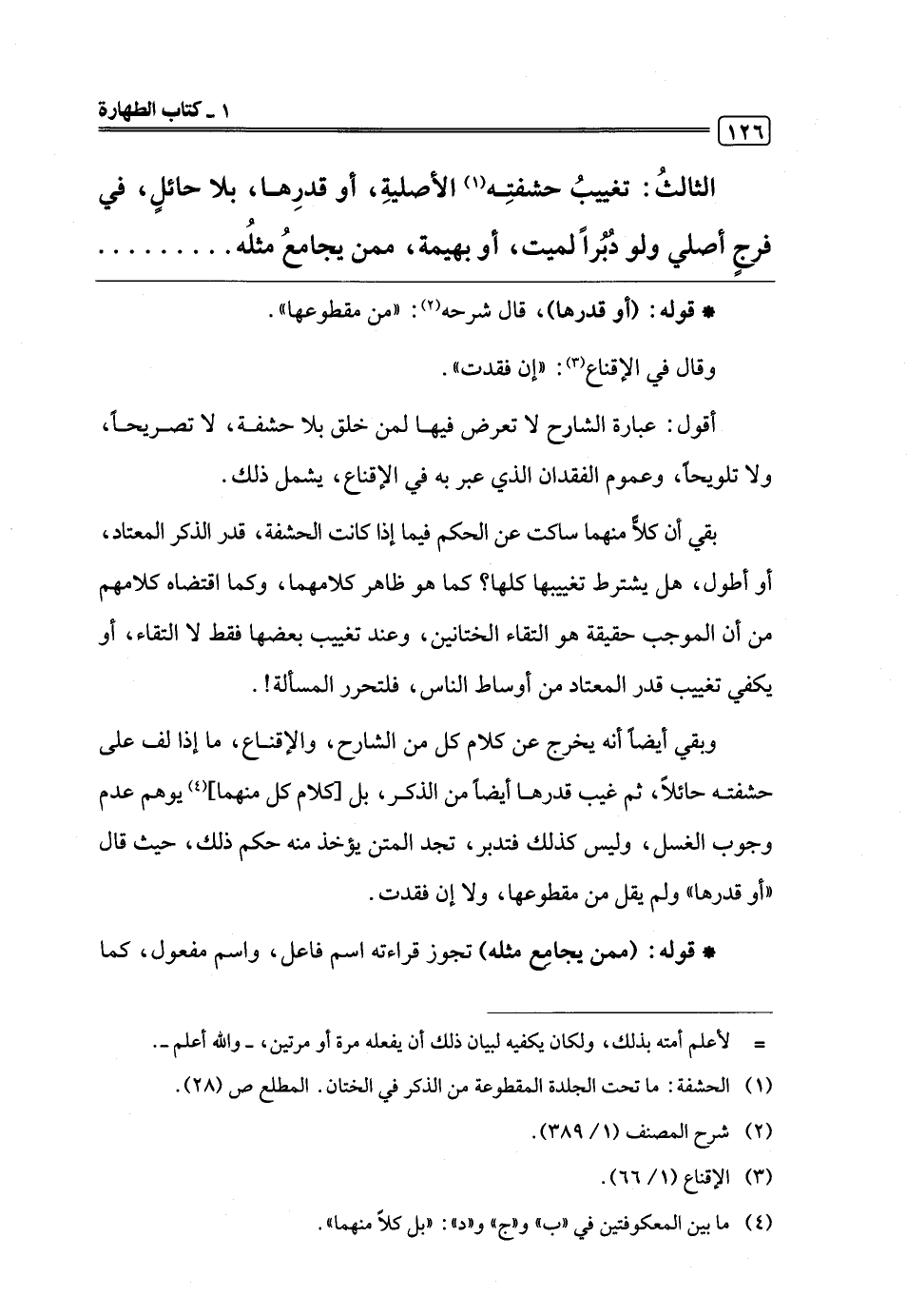 وبقي أيضًا أنه يخرج عن كلام كل من الشارح، والإقناع، ما إذا لف على حشفته حائلًا، ثم غيب قدرها أيضًا من الذكر، بل [كلام كل منهما] (¬4) يوهم عدم وجوب الغسل، وليس كذلك فتدبر، تجد المتن يؤخذ منه حكم ذلك، حيث قال "أو قدرها" ولم يقل من مقطوعها، ولا إن فقدت.