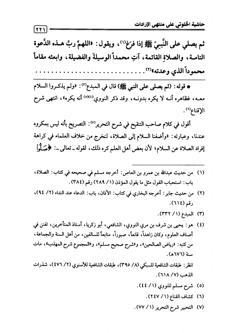 * قوله: (ثم يصلى على النبي -صلى اللَّه عليه وسلم-) قال في المبدع (¬3): "ولم يذكروا السلام معه، فظاهره أنه لا يكره بدونه، وقد ذكر النووي (¬4) (¬5) أنه يكره"، انتهى شرح الإقناع (¬6).
