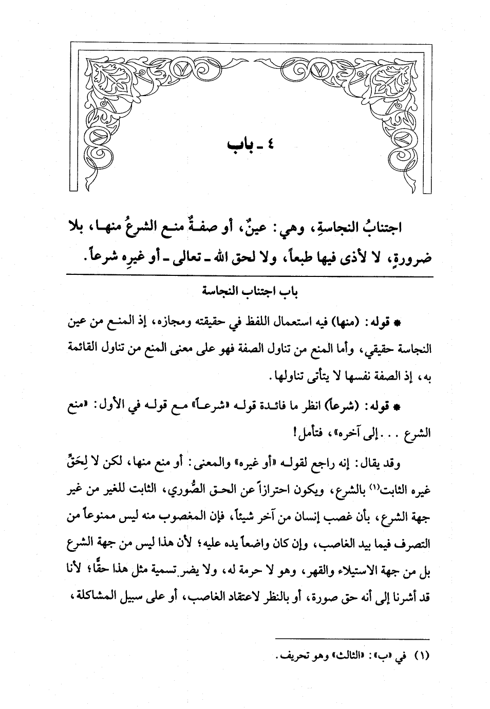 اجتنابُ النجاسةِ، وهي: عينٌ، أو صفةٌ منع الشرعُ منها، بلا ضرورةٍ، لا لأذى فيها طبعًا، ولا لحق اللَّه -تعالى- أو غَيرِه شرعًا.