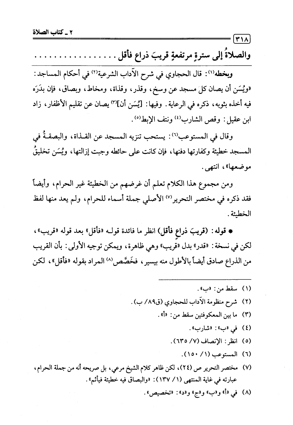 والصلاةُ إلى سترةٍ مرتفعةٍ قريبَ ذراع فأقل. . . . . .