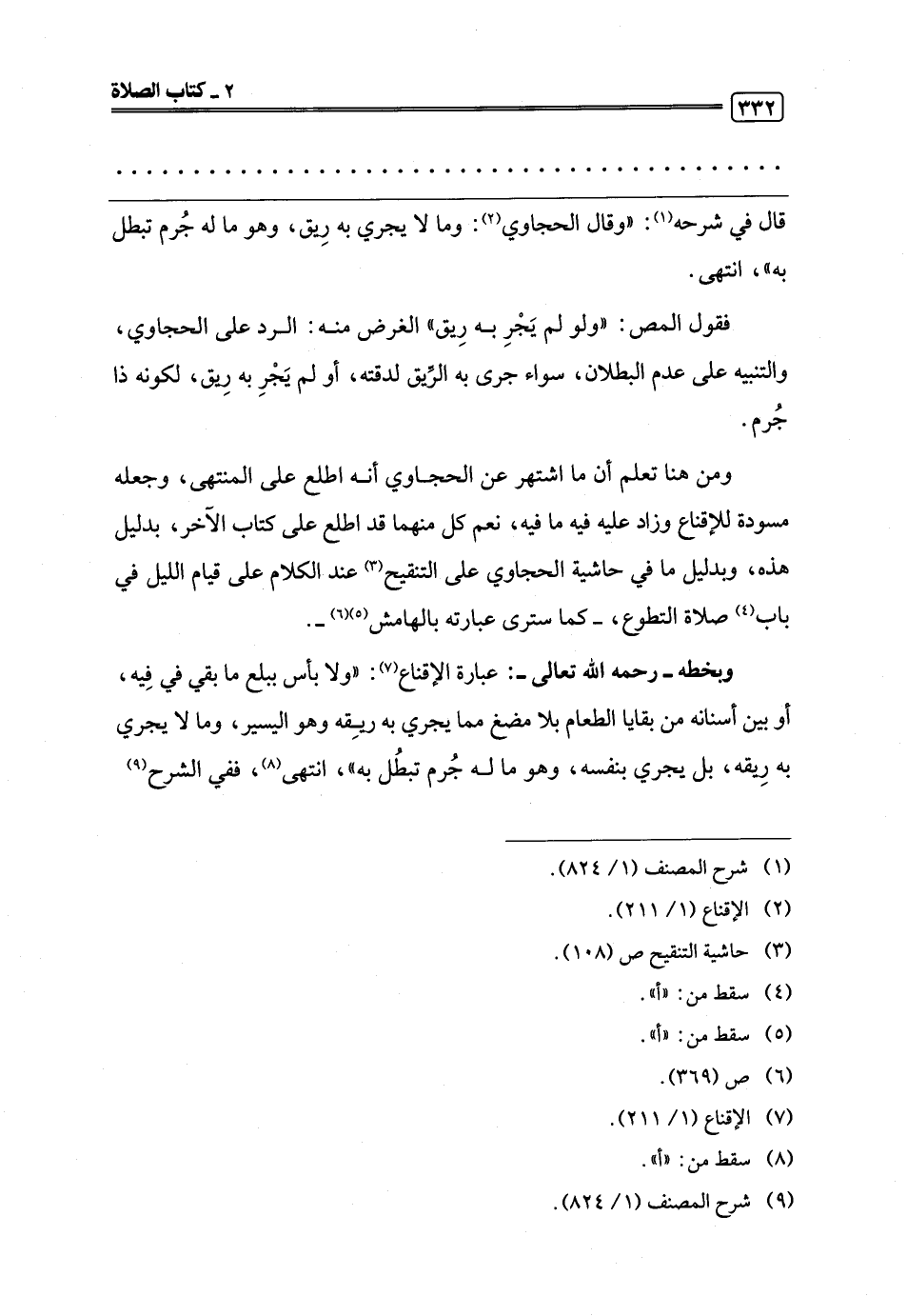 ومن هنا تعلم أن ما اشتهر عن الحجاوي أنه اطلع على المنتهى، وجعله مسودة للإقناع وزاد عليه فيه ما فيه، نعم كل منهما قد اطلع على كتاب الآخر، بدليل هذه، وبدليل ما في حاشية الحجاوي على التنقيح (¬3) عند الكلام على قيام الليل في باب (¬4) صلاة التطوع، -كما سترى عبارته بالهامش (¬5) (¬6) -.