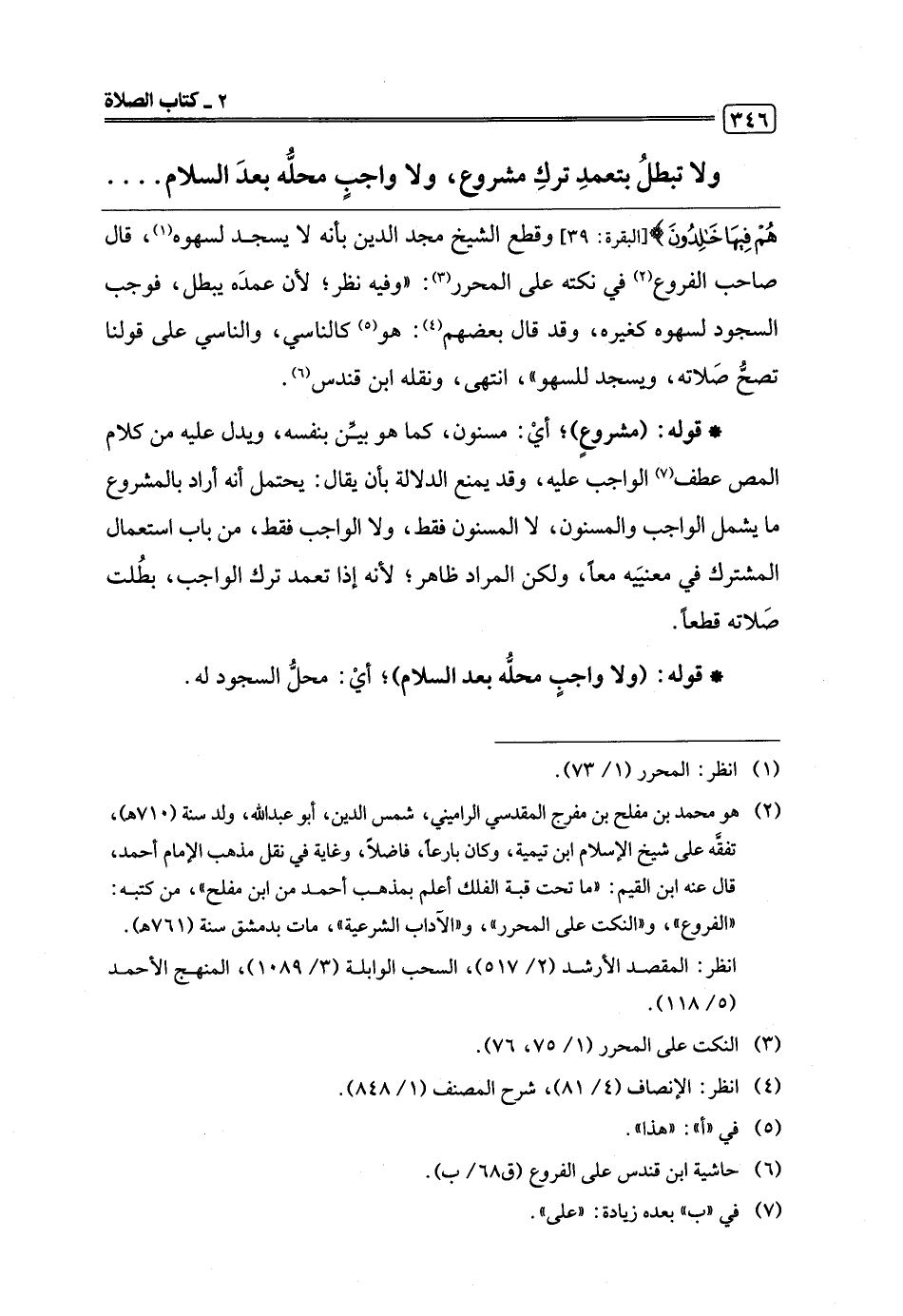 (¬2) هو محمد بن مفلح بن مفرج المقدسي الراميني، شمس الدين، أبو عبد اللَّه، ولد سنة (710 هـ)، تفقَّه على شيخ الإسلام ابن تيمية، وكان بارعًا، فاضلًا، وغاية في نقل مذهب الإمام أحمد، قال عنه ابن القيم: "ما تحت قبة الفلك أعلم بمذهب أحمد من ابن مفلح"، من كتبه: "الفروع"، و"النكت على المحرر"، و"الآداب الشرعية"، مات بدمشق سنة (761 هـ).
