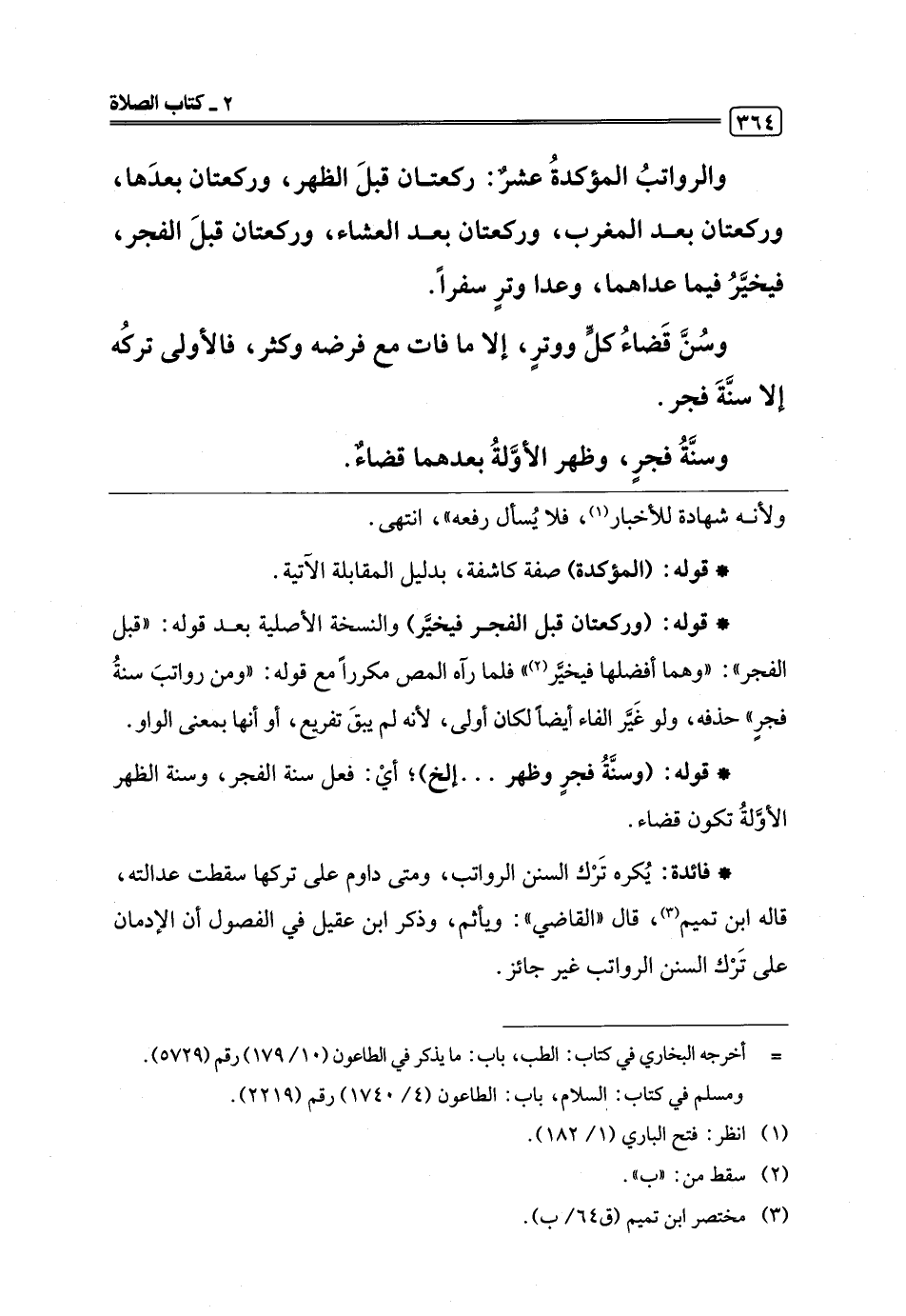 والرواتبُ المؤكدةُ عشرٌ: ركعتان قبلَ الظهر، وركعتان بعدَها، وركعتان بعد المغرب، وركعتان بعد العشاء، وركعتان قبلَ الفجر، فيخيَّرُ فيما عداهما، وعدا وترٍ سفرًا.