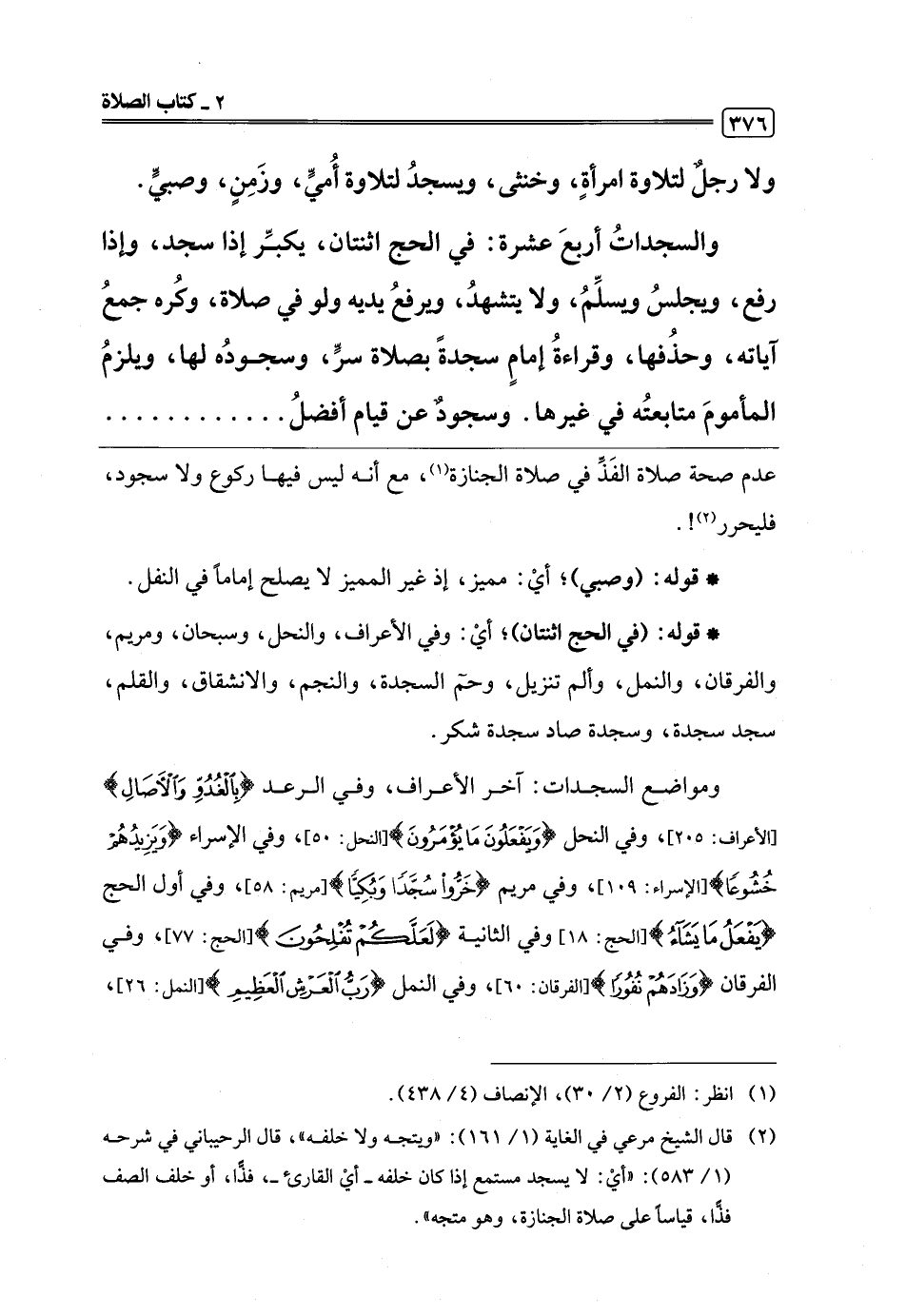 والسجداتُ أربعَ عشرة: في الحج اثنتان، يكبِّر إذا سجد، وإذا رفع، ويجلسُ ويسلِّمُ، ولا يتشهدُ، ويرفعُ يديه ولو في صلاة، وكُره جمعُ آياته، وحذُفها، وقراءةُ إمامٍ سجدةً بصلاة سرٍّ، وسجودُه لها، ويلزمُ المأمومَ متابعتُه في غيرها. وسجودٌ عن قيام أفضلُ. . . . . .