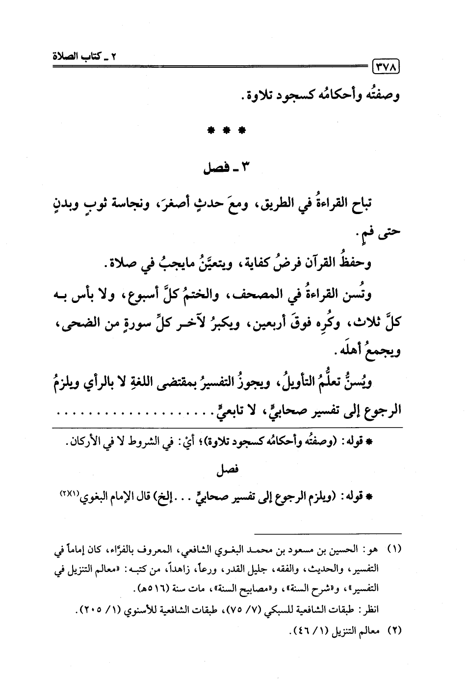ويُسنُّ تعلُّمُ التأويلُ، ويجوزُ التفسيرُ بمقتضى اللغةِ لا بالرأي ويلزمُ الرجوع إلى تفسير صحابيٍّ، لا تابعيٍّ. . . . . .