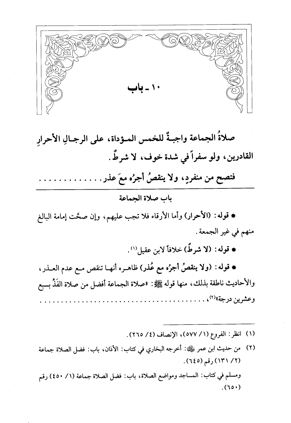 * قوله: (ولا ينقصُ أجرُه مع عُذر) ظاهره أنها تنقص مع عدم العذر، والأحاديث ناطقة بذلك، منها قوله -صلى اللَّه عليه وسلم-: "صلاة الجماعة أفضل من صلاة الفَذِّ بسبع وعشرين درجة" (¬2)،. . . . . .
