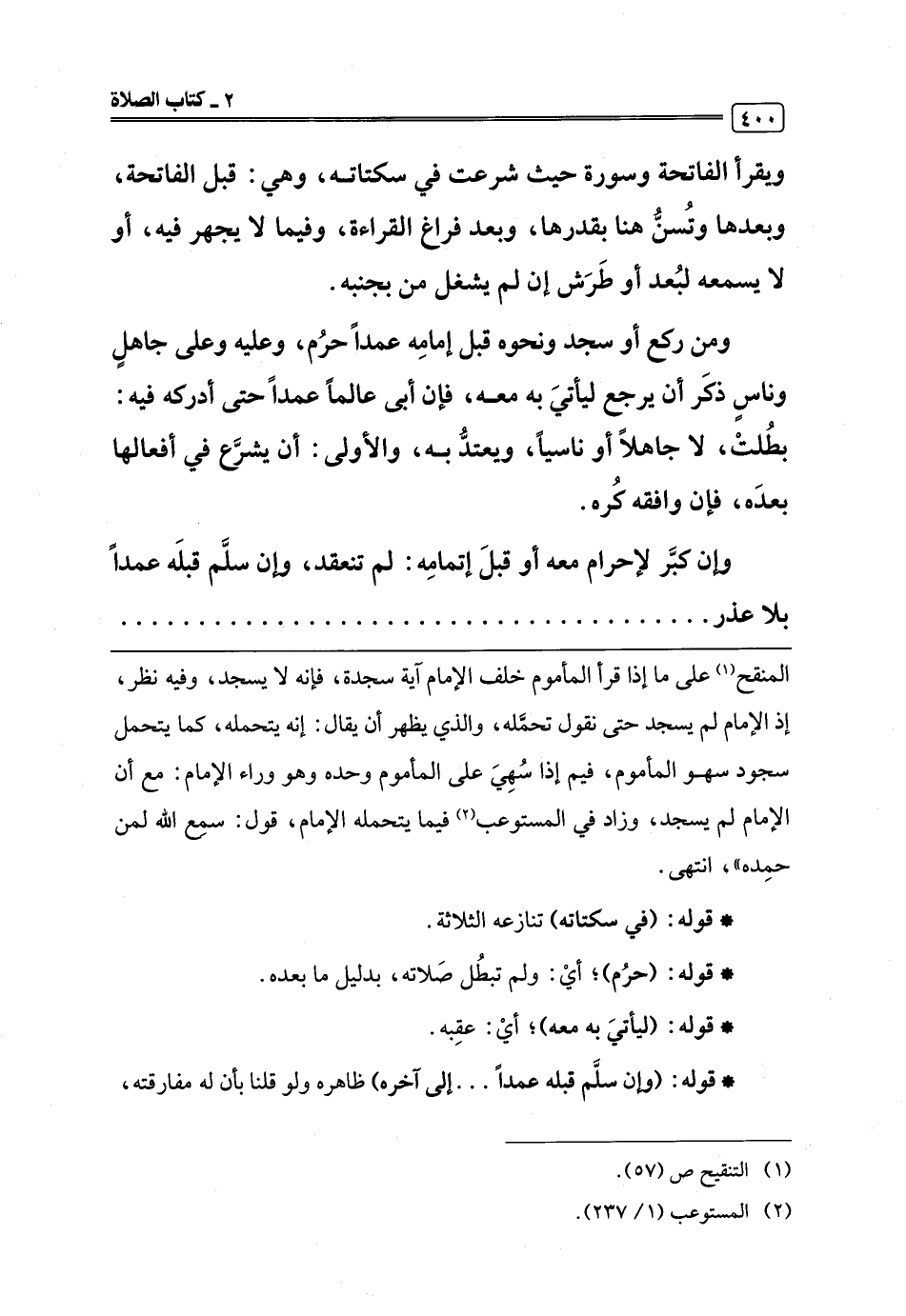 ومن ركع أو سجد ونحوه قبل إمامِه عمدًا حرُم، وعليه وعلى جاهلٍ وناسٍ ذكَر أن يرجع ليأتيَ به معه، فإن أبى عالمًا عمدًا حتى أدركه فيه: بطُلتْ، لا جاهلًا أو ناسيًا، ويعتدُّ به، والأولى: أن يشرَّع في أفعالها بعدَه، فإن وافقه كُره.