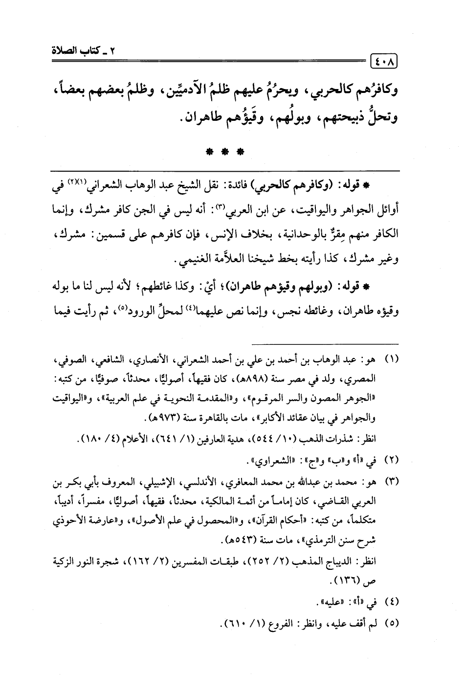 * قوله: (وكافرهم كالحربي) فائدة: نقل الشيخ عبد الوهاب الشعراني (¬1) (¬2) في أوائل الجواهر واليواقيت، عن ابن العربي (¬3): أنه ليس في الجن كافر مشرك، وإنما الكافر منهم مِقرٌّ بالوحدانية، بخلاف الإنس، فإن كافرهم على قسمين: مشرك، وغير مشرك، كذا رأيته بخط شيخنا العلَّامة الغنيمي.
