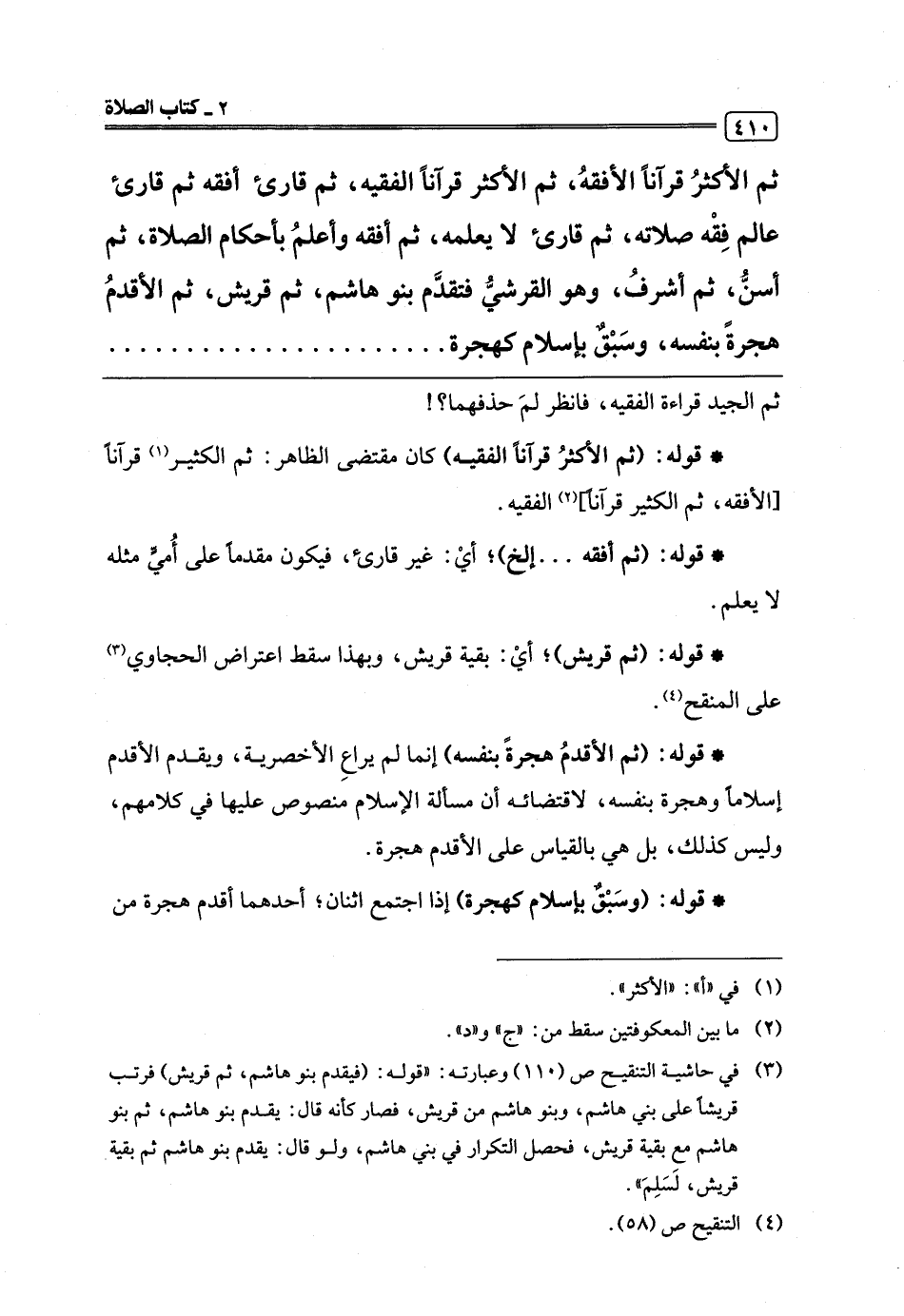 ثم الأكثرُ قرآنًا الأفقهُ، ثم الأكثر قرآنًا الفقيه، ثم قارئ أفقه ثم قارئ عالم فِقْه صلاته، ثم قارئ لا يعلمه، ثم أفقه وأعلمُ بأحكام الصلاة، ثم أسنُّ، ثم أشرفُ، وهو القرشيُّ فتقدَّم بنو هاشم، ثم قريش، ثم الأقدمُ هجرةً بنفسه، وسَبْقٌ بإسلام كهجرة. . . . . .