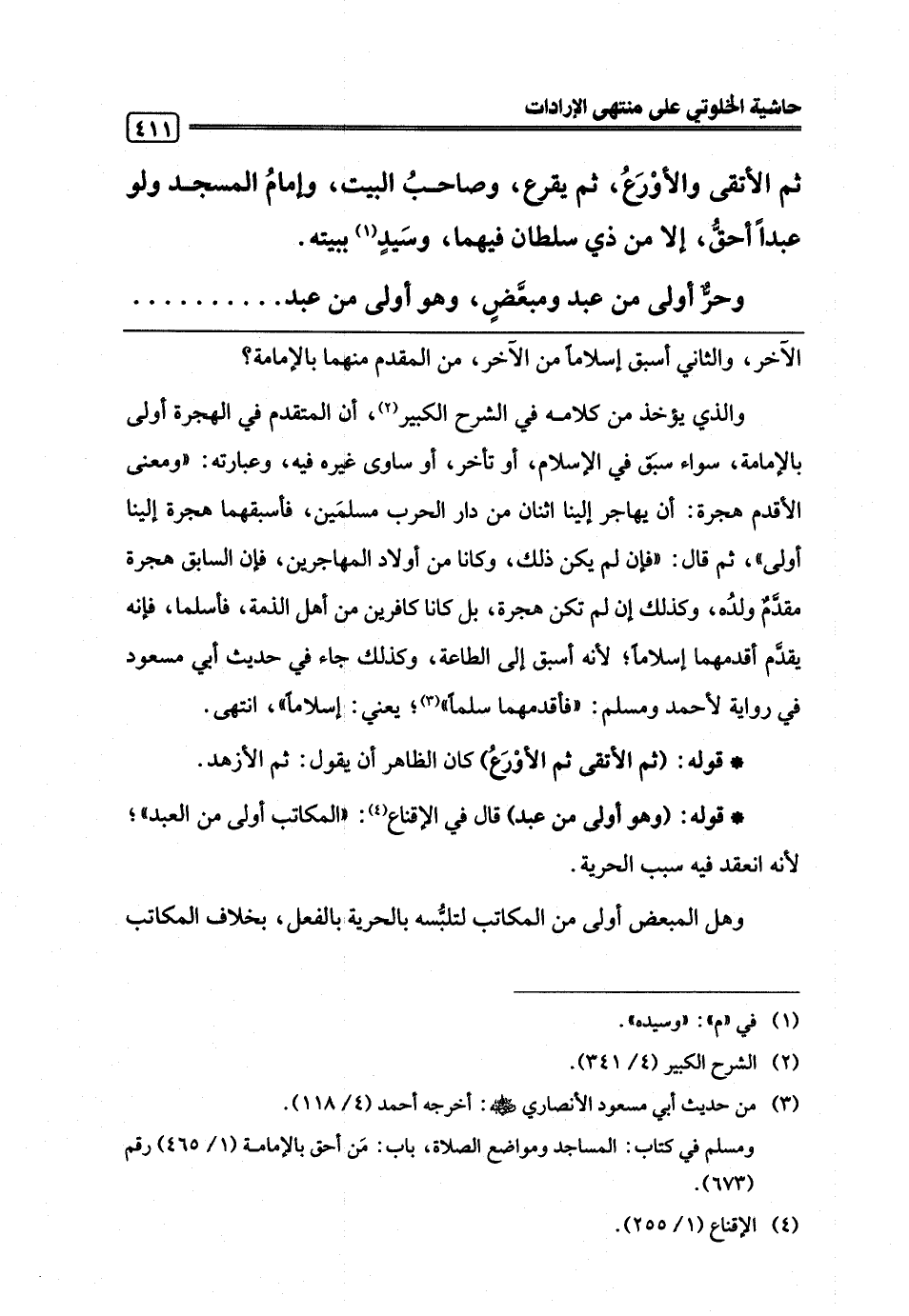 * قوله: (وهو أولى من عبد) قال في الإقناع (¬4): "المكاتب أولى من العبد"؛ لأنه انعقد فيه سبب الحرية.