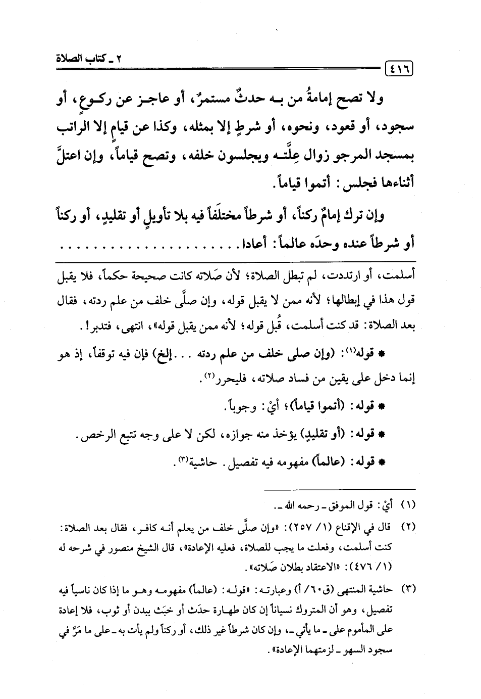 (¬3) حاشية المنتهى (ق 60/ أ) وعبارته: "قوله: (عالمًا) مفهومه وهو ما إذا كان ناسيًا فيه تفصيل، وهو أن المتروك نسيانًا إن كان طهارة حدَث أو خبَث ببدن أو ثوب، فلا إعادة على المأموم على -ما يأتي-، وإن كان شرطًا غير ذلك، أو ركنًا ولم يأت به -على ما مَرَّ في سجود السهو- لزمتهما الإعادة".