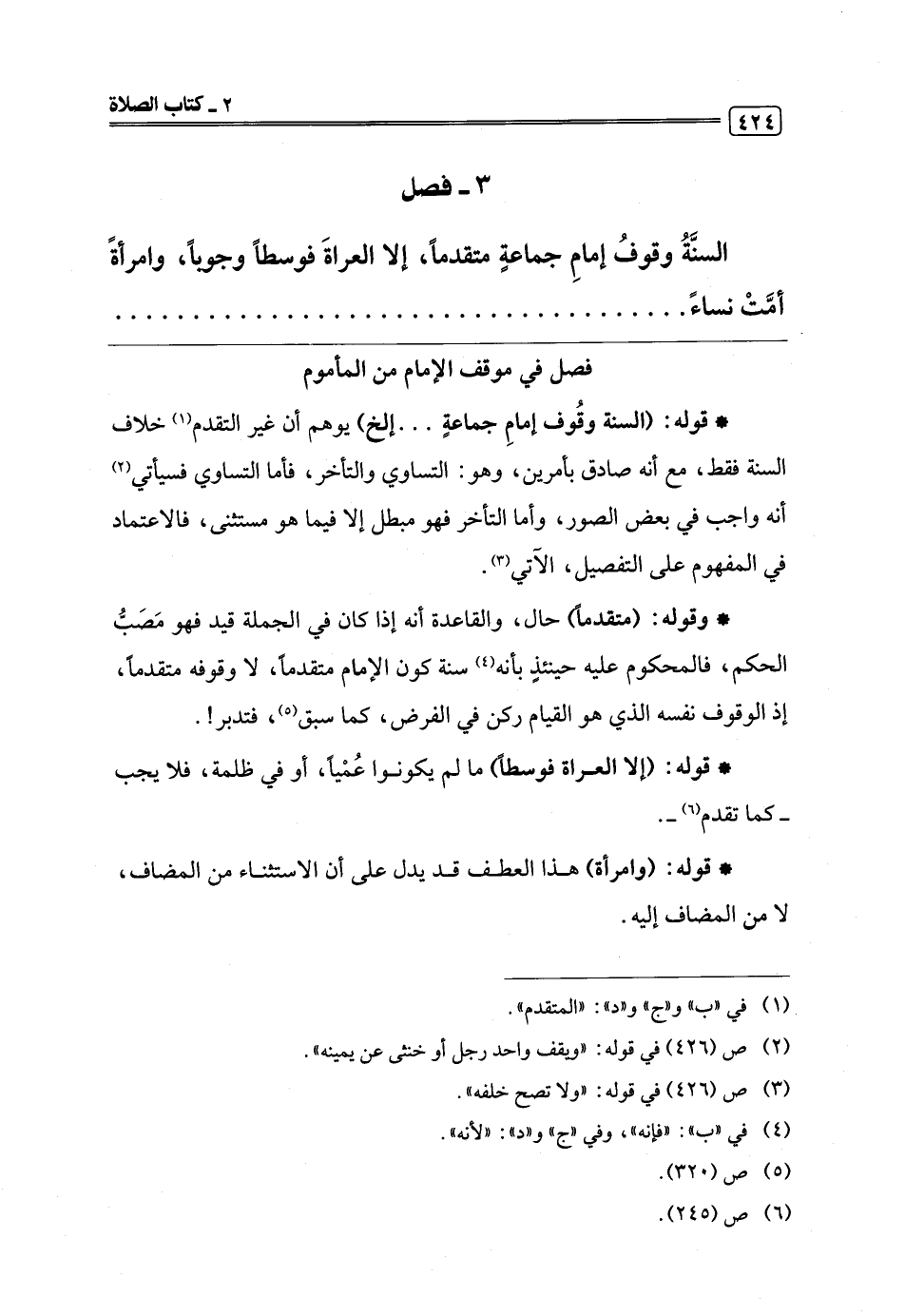* قوله: (السنة وقُوف إمامِ جماعةٍ. . . إلخ) يوهم أن غير التقدم (¬1) خلاف السنة فقط، مع أنه صادق بأمرين، وهو: التساوي والتأخر، فأما التساوي فسيأتي (¬2) أنه واجب في بعض الصور، وأما التأخر فهو مبطل إلا فيما هو مستثنى، فالاعتماد في المفهوم على التفصيل، الآتي (¬3).
