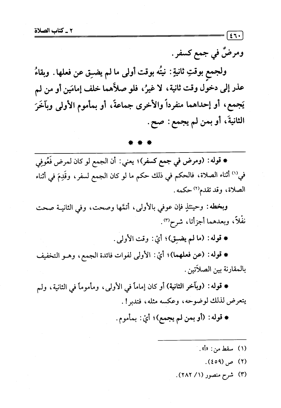 * قوله: (ومرض في جمع كسفر)؛ يعني: أن الجمع لو كان لمرض فَعُوفِي في (¬1) أثناء الصلاة، فالحكم في ذلك حكم ما لو كان الجمع لسفر، وقَدِمَ في أثناء الصلاة، وقد تقدم (¬2) حكمه.