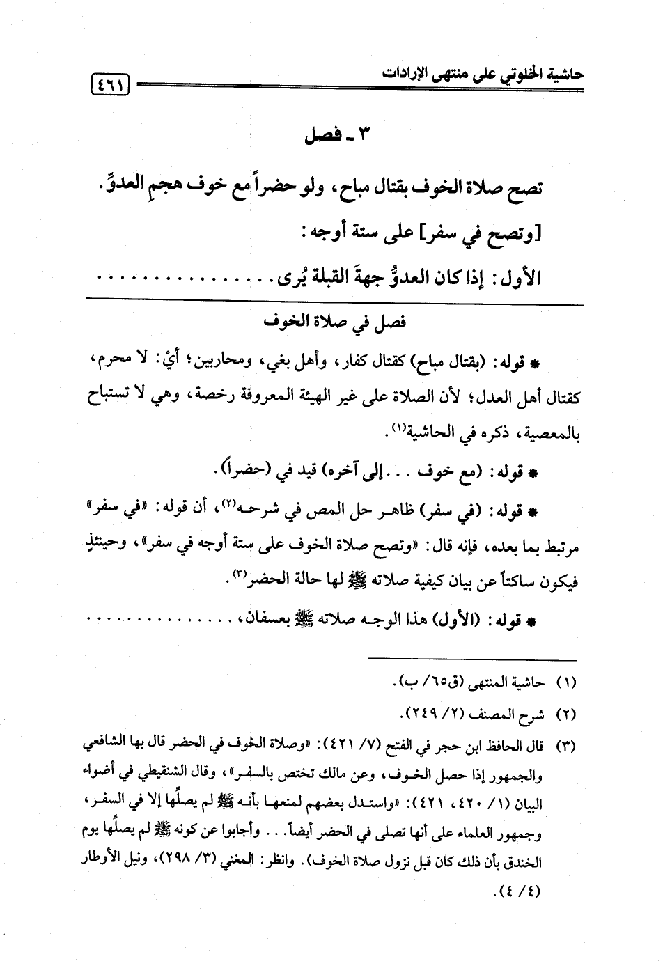 (¬3) قال الحافظ ابن حجر في الفتح (7/ 421): "وصلاة الخوف في الحضر قال بها الشافعي والجمهور إذا حصل الخوف، وعن مالك تختص بالسفر"، وقال الشنقيطي في أضواء البيان (1/ 420، 421): "واستدل بعضهم لمنعها بأنه -صلى اللَّه عليه وسلم- لم يصلِّها إلا في السفر، وجمهور العلماء على أنها تصلى في الحضر أيضًا. . . وأجابوا عن كونه -صلى اللَّه عليه وسلم- لم يصلِّها يوم الخندق بأن ذلك كان قبل نزول صلاة الخوف). وانظر: المغني (3/ 298)، ونيل الأوطار (4/ 4).