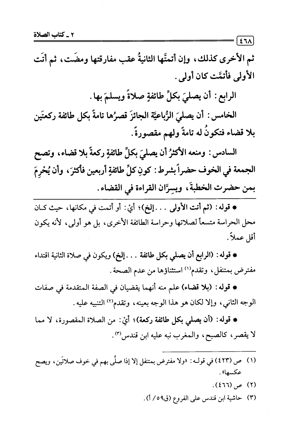 * قوله: (أن يصلي بكل طائفة ركعة)؛ أيْ: من الصلاة المقصورة، لا مما لا يقصر، كالصبح، والمغرب نبه عليه ابن قندس (¬3).