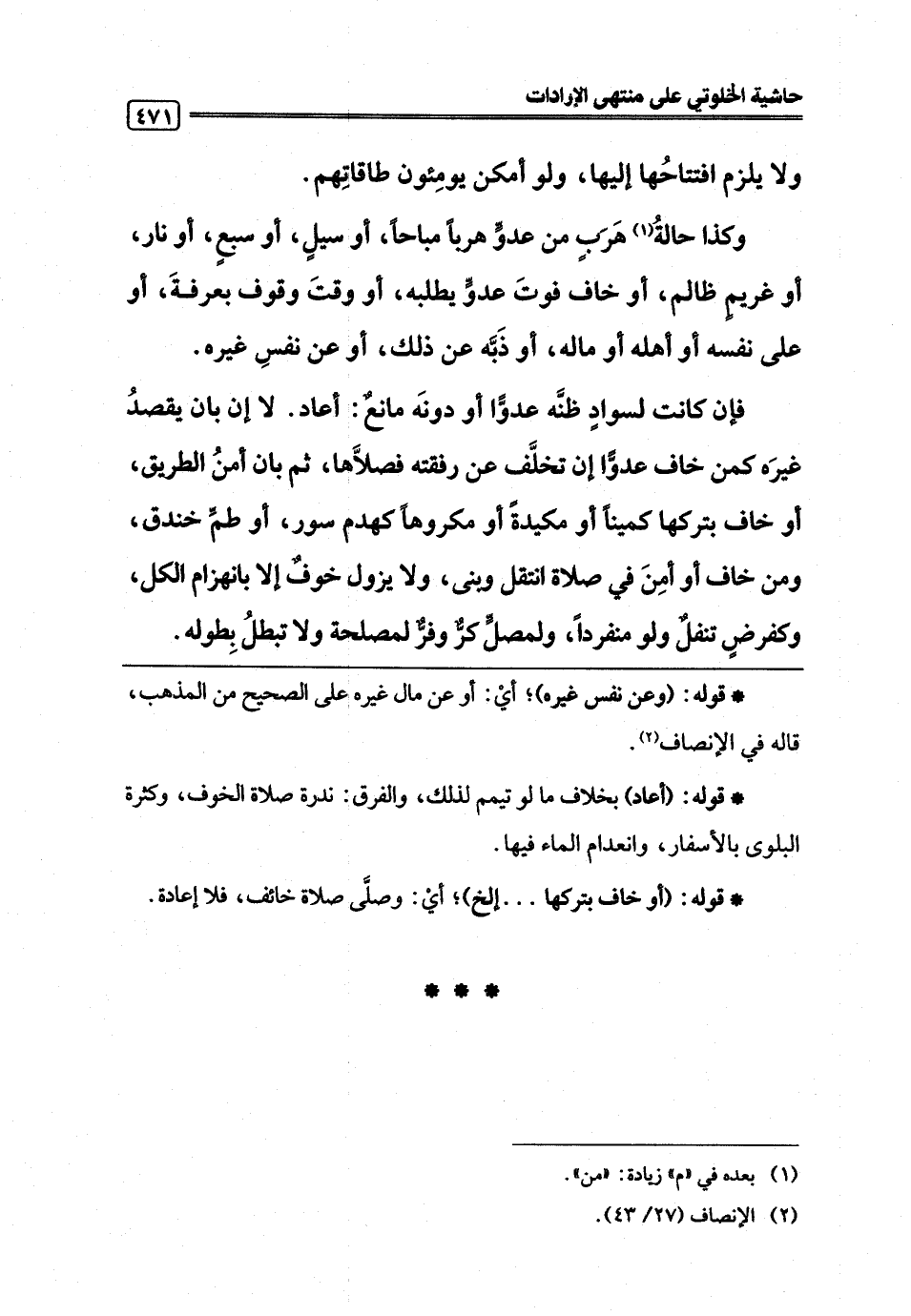 فإن كانت لسوادٍ ظنَّه عدوًّا أو دونَه مانعٌ: أعاد. لا إن بان يقصدُ غيرَه كمن خاف عدوًّا إن تخلَّف عن رفقته فصلَّاها، ثم بأن أمنُ الطريق، أو خاف بتركها كمينًا أو مكيدةً أو مكروهًا كهدم سور، أو طمِّ خندق، ومن خاف أو أمِنَ في صلاة انتقل وشى، ولا يزول خوفٌ إلا بانهزام الكل، وكفرضٍ تنفلٌ ولو منفردًا، ولمصلٍّ كرٌّ وفرٌّ لمصلحة ولا تبطلُ بِطوله.