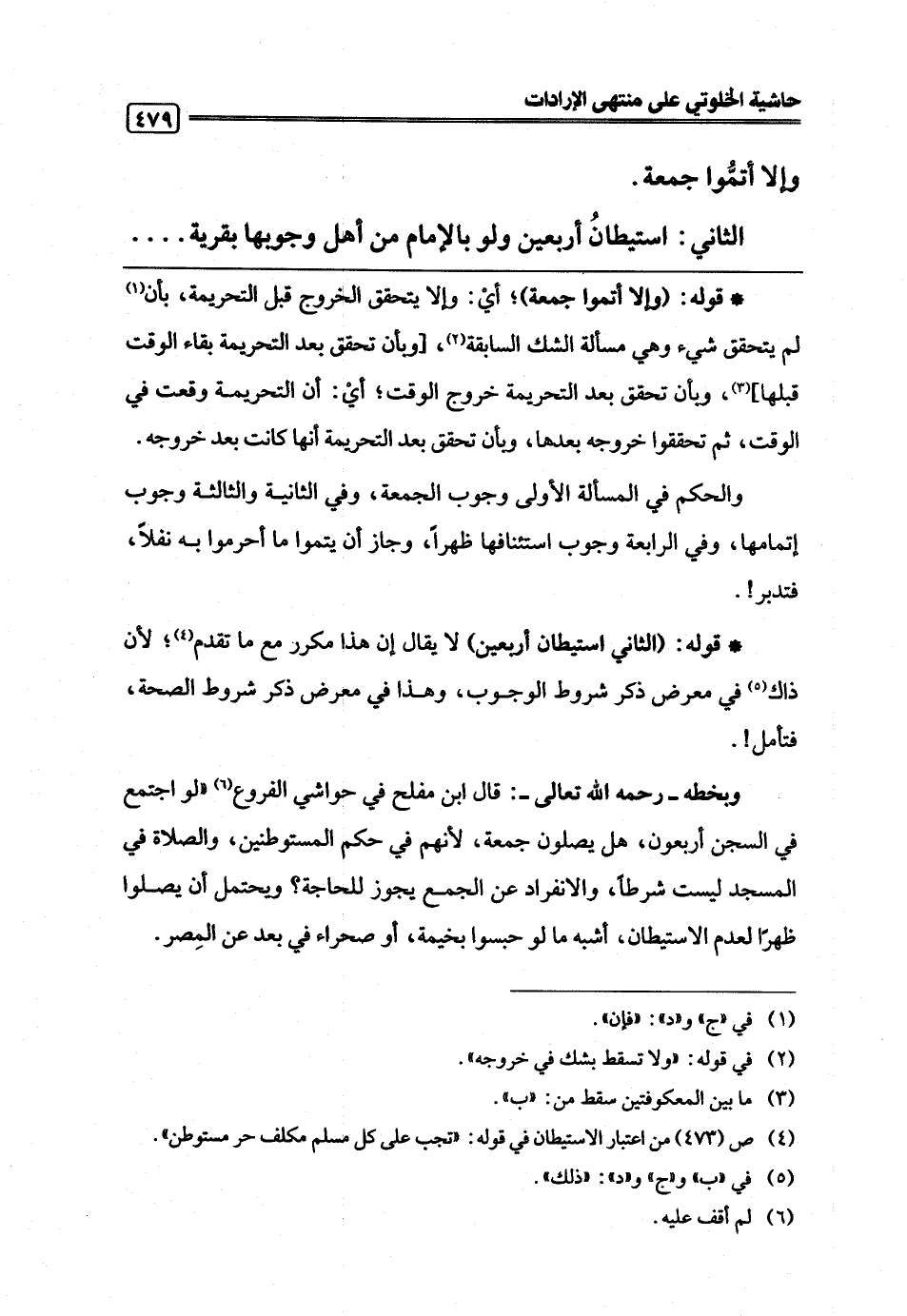 وبخطه -رحمه اللَّه تعالى-: قال ابن مفلح في حواشي الفروع (¬6) "لو اجتمع في السجن أربعون، هل يصلون جمعة، لأنهم في حكم المستوطنين، والصلاة في المسجد ليست شرطًا، والانفراد عن الجمع يجوز للحاجة؛ ويحتمل أن يصلوا ظهرًا لعدم الاستيطان، أشبه ما لو حبسوا بخيمة، أو صحراء في بعد عن المِصر.
