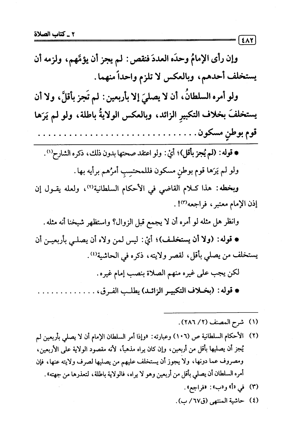 (¬2) الأحكام السلطانية ص (106) وعبارته: "وإذا أمر السلطان الإمام أن لا يصلي بأربعين لم يُجز أن يصليها بأقل من أربعين، وإن كان يراه مذهبًا، لأنه مقصود الولاية على الأربعين، ومصروف عما دونها، ولا يجوز أن يستخلف عليهم من يصليها لصرف ولايته عنها، فإن أمره السلطان أن يصلي بأقل من أربعين وهو لا يراه، فالولاية باطلة، لتعذرها من جهته".