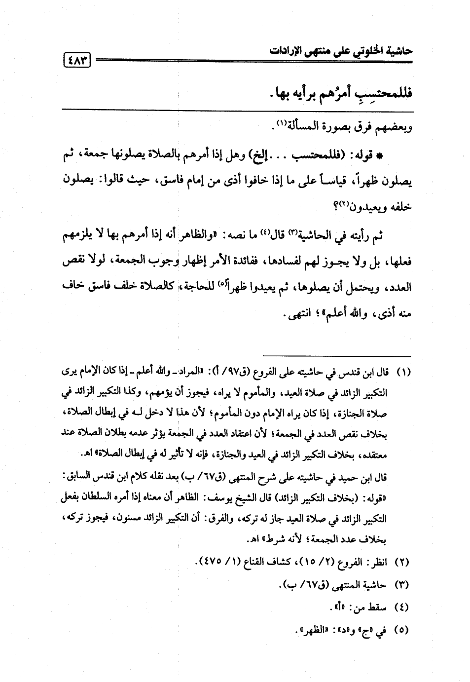 قال ابن حميد في حاشيته على شرح المنتهي (ق 67/ ب) بعد نقله كلام ابن قندس السابق: "قوله: (بخلاف التكبير الزائد) قال الشيخ يوسف: الظاهر أن معناه إذا أمره السلطان بفعل التكبير الزائد في صلاة العيد جاز له تركه، والفرق: أن التكبير الزائد مسنون، فيجوز تركه، بخلاف عدد الجمعة؛ لأنه شرط" اهـ.