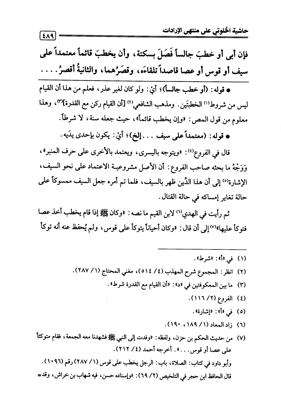 (¬7) من حديث الحكم بن حزن، ولفظه: (وفدت إلى النبي -صلى اللَّه عليه وسلم- فشهدنا معه الجمعة، فقام متوكئًا على عصا أو قوس. . . ". أخرجه أحمد (4/ 212).