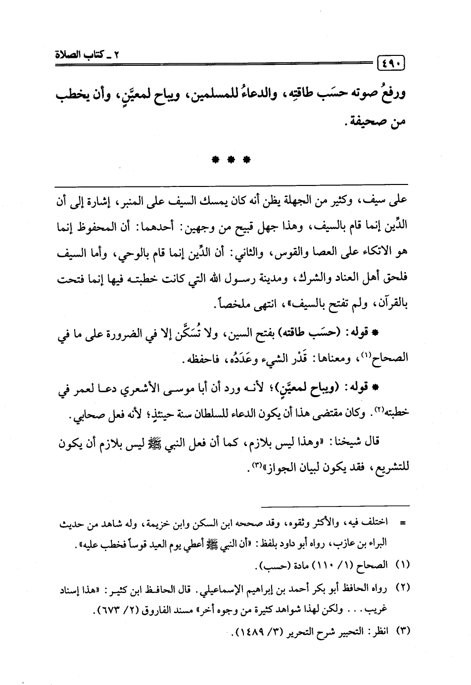 ورفعُ صوته حسَب طاقتِه، والدعاءُ للمسلمين، ويباح لمعيَّنٍ، وأن يخطب من صحيفة.