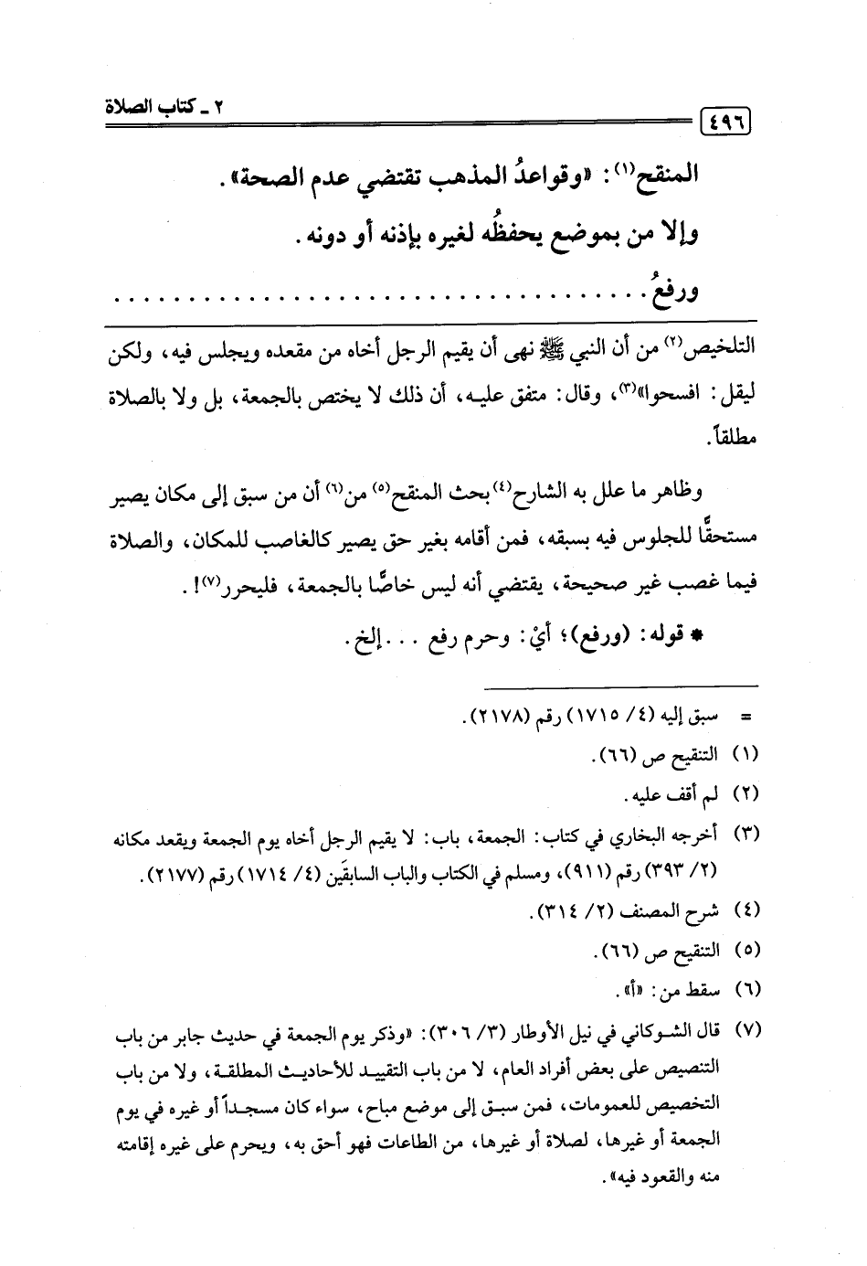 التلخيص (¬2) من أن النبي -صلى اللَّه عليه وسلم- نهى أن يقيم الرجل أخاه من مقعده ويجلس فيه، ولكن ليقل: افسحوا" (¬3)، وقال: متفق عليه، أن ذلك لا يختص بالجمعة، بل ولا بالصلاة مطلقًا.