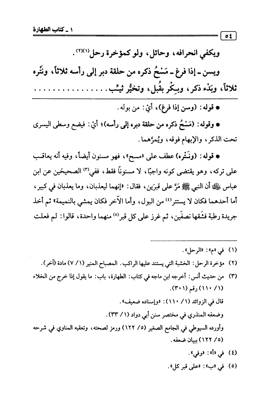 * قوله: (ونَتْره) عطف على "مسح"، فهو مسنون أيضًا، وفيه أنه يعاقب على تركه، وهو يقتضى كونه واجبًا، لا مسنونًا فقط، ففي (¬3) الصحيحَين عن ابن عباس -رضي اللَّه عنهما- أن النبي -صلى اللَّه عليه وسلم- مرَّ على قبرَين، فقال: "إنهما ليعذبان، وما يعذبان في كبير، أما أحدهما فكان لا يستتر (¬4) من البول، وأما الآخر فكان يمشي بالنميمة" ثم أخذ جريدة رطبة فشَقها نصفَين، ثم غرز على كل قبر (¬5) منهما واحدة؛ قالوا: لم فعلت