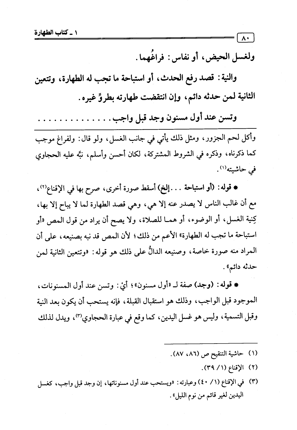(¬3) في الإقناع (1/ 40) وعبارته: "ويستحب عند أول مسنوناتها، إن وجد قبل واجب، كغسل اليدين لغير قائم من نوم الليل".