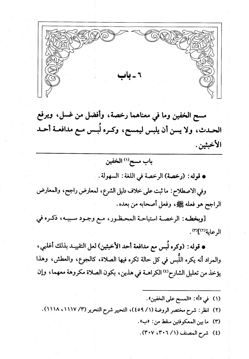 مسح الخفين وما في معناهما رخصة، وأفضل من غسل، ويرفع الحديث، ولا يسن أن يلبس ليمسح، وكره لُبس مع مدافعة أحد الأخبثين.