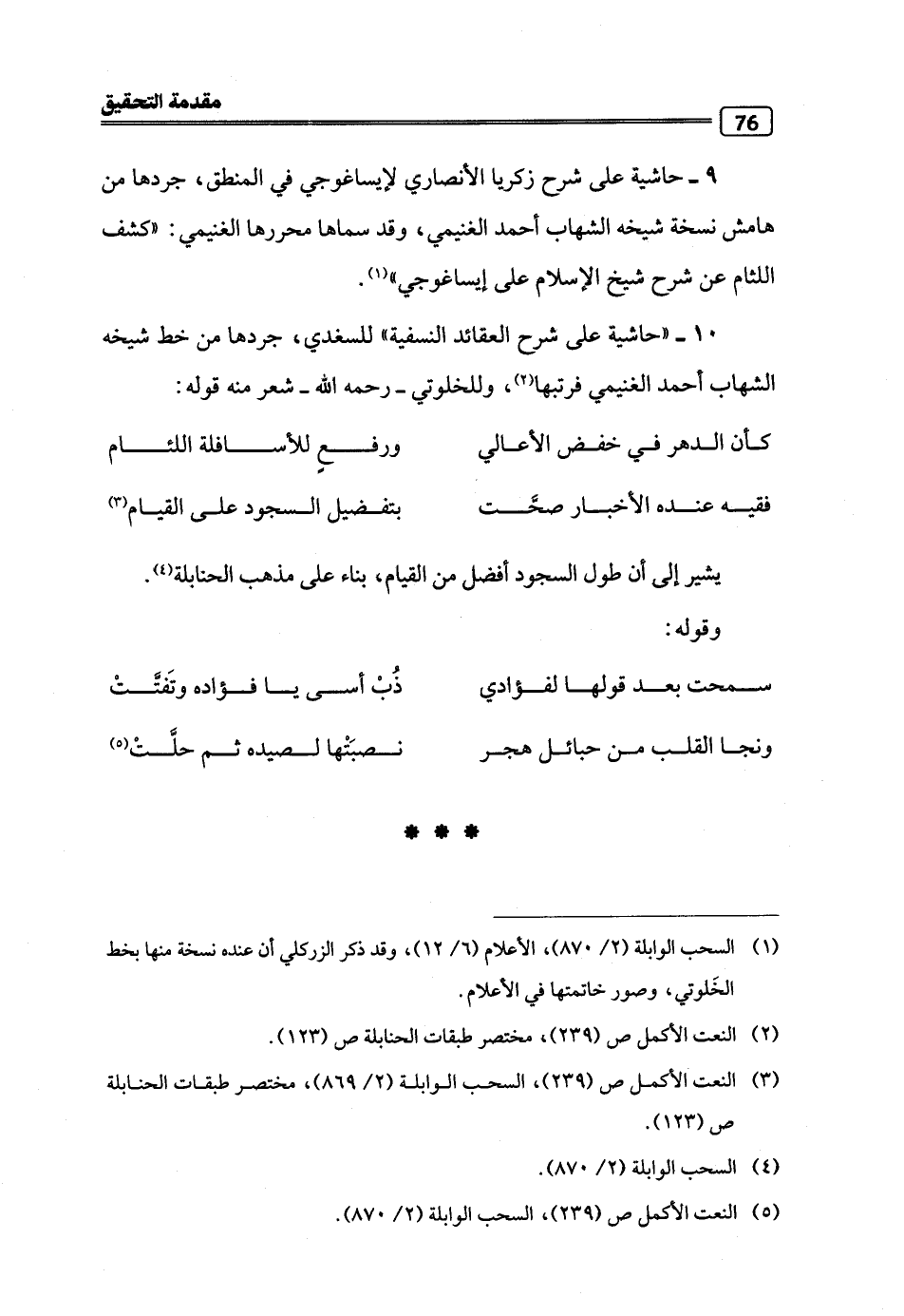 10 - "حاشية على شرح العقائد النسفية" للسغدي، جردها من خط شيخه الشهاب أحمد الغنيمي فرتبها (¬2)، وللخلوتي -رحمه اللَّه- شعر منه قوله: