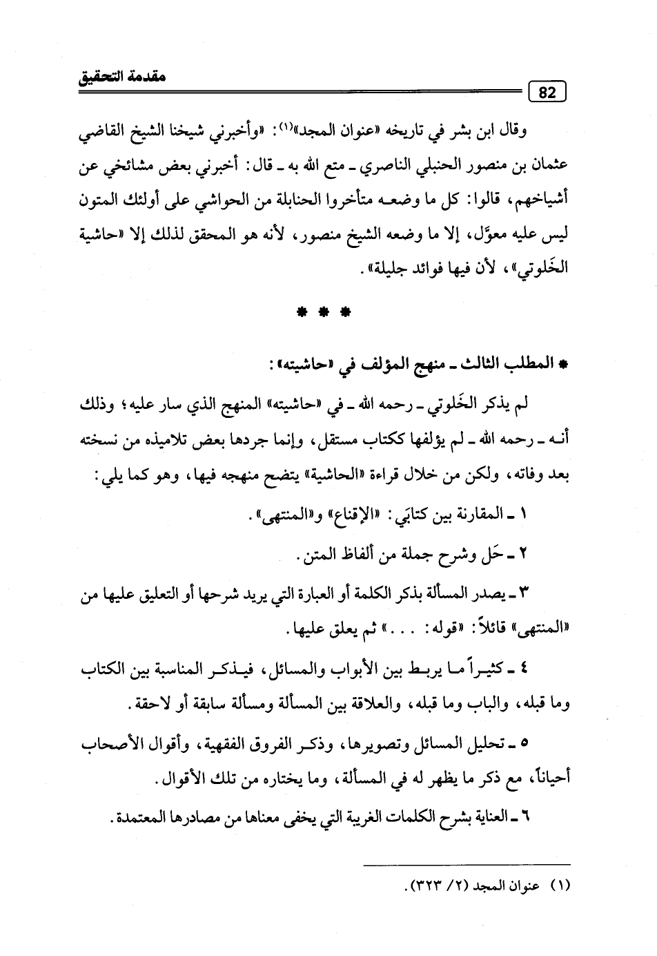 وقال ابن بشر في تاريخه "عنوان المجد" (¬1): "وأخبرني شيخنا الشيخ القاضي عثمان بن منصور الحنبلي الناصري -متع اللَّه به- قال: أخبرني بعض مشائخي عن أشياخهم، قالوا: كل ما وضعه متأخروا الحنابلة من الحواشي على أولئك المتون ليس عليه معوَّل، إلا ما وضعه الشيخ منصور؛ لأنه هو المحقق لذلك إلا "حاشية الخَلوتي"، لأن فيها فوائد جليلة".