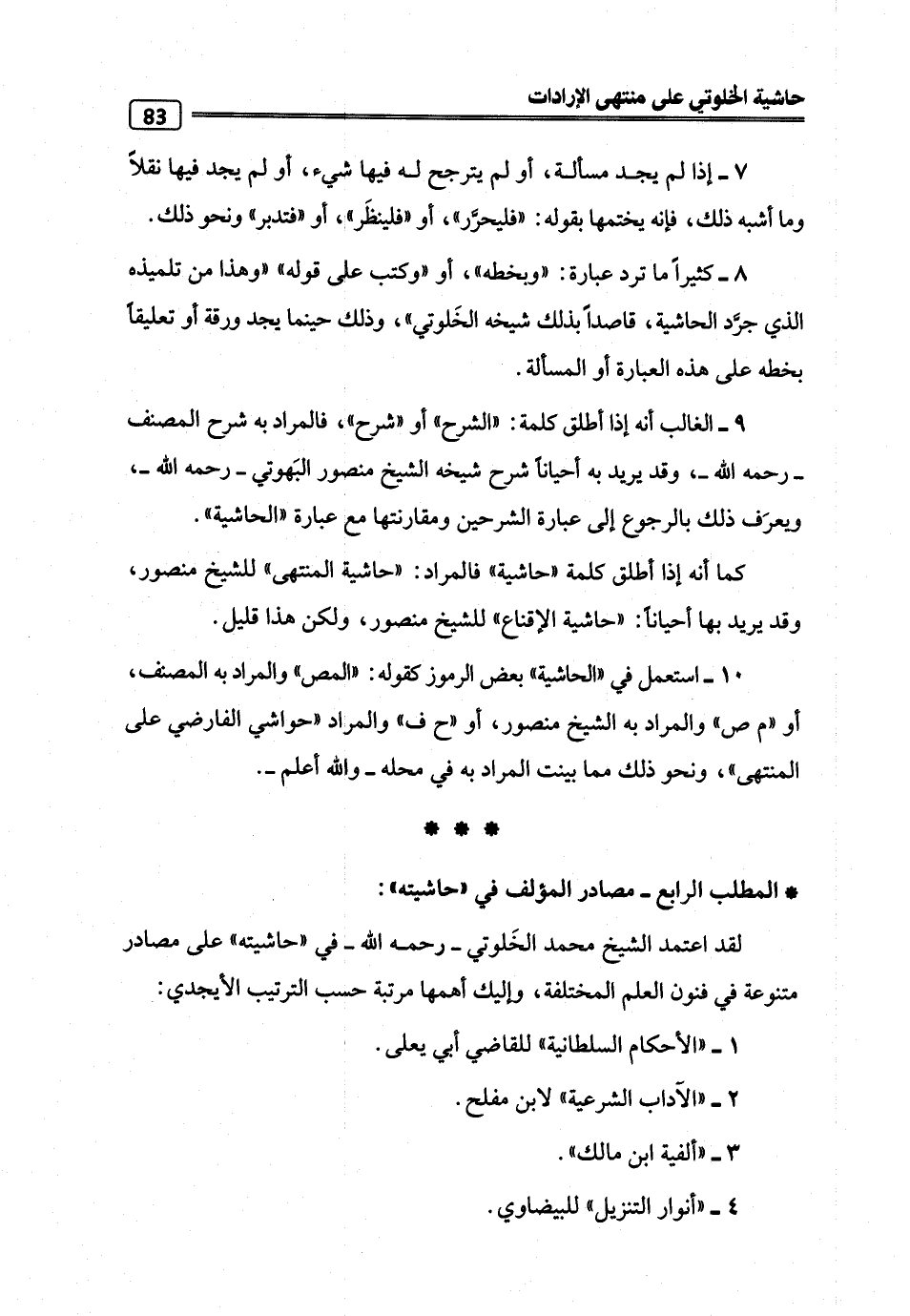 9 - الغالب أنه إذا أطلق كلمة: "الشرح" أو "شرح"، فالمراد به شرح المصنف -رحمه اللَّه-، وقد يريد به أحيانًا شرح شيخه الشيخ منصور البَهوتي -رحمه اللَّه-، ويعرَف ذلك بالرجوع إلى عبارة الشرحين ومقارنتها مع عبارة "الحاشية".