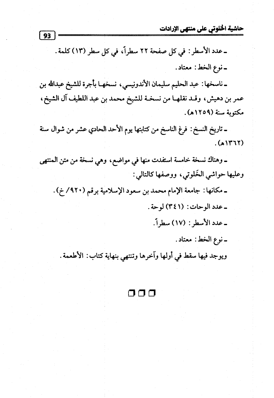 - وهناك نسخة خامسة استفدت منها في مواضع، وهي نسخة من متن المنتهى وعليها حواشي الخَلوتي، ووصفها كالتالي: