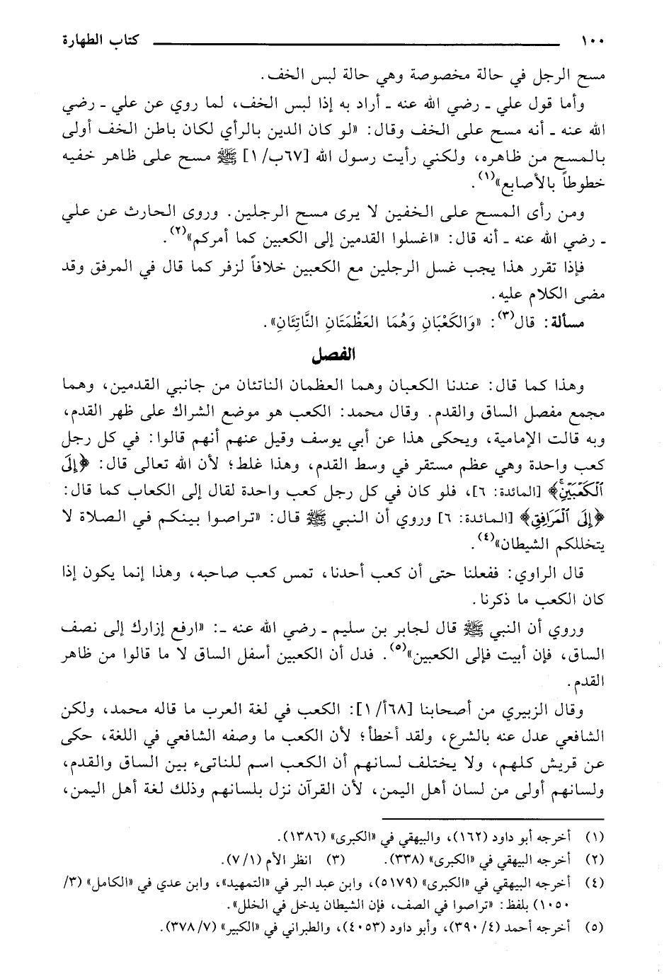 وهذا كما قال: عندنا الكعبان وهما العظمان النائتان من جانبي القدمين، وهما مجمع مفصل الساق والقدم. وقال محمد: الكعب هو موضع الشراك على ظهر القدم، وبه قالت الإمامية، ويحكى هذا عن أبي يوسف وقيل عنهم أنهم قالوا: في كل رجل كعب واحدة وهي عظم مستقر في وسط القدم، وهذا غلط؛ لأن الله تعالى قال: {إلَى الكَعْبَيْنِ} [المائدة:6]، فلو كان في كل رجل كعب واحدة لقال إلى الكعاب كما قال: {إلَى المَرَافِقِ} [المائدة:6]، وروي أن النبي صلى الله عليه وسلم قال: "تراصوا بينكم في الصلاة لا يتخللكم الشيطان".