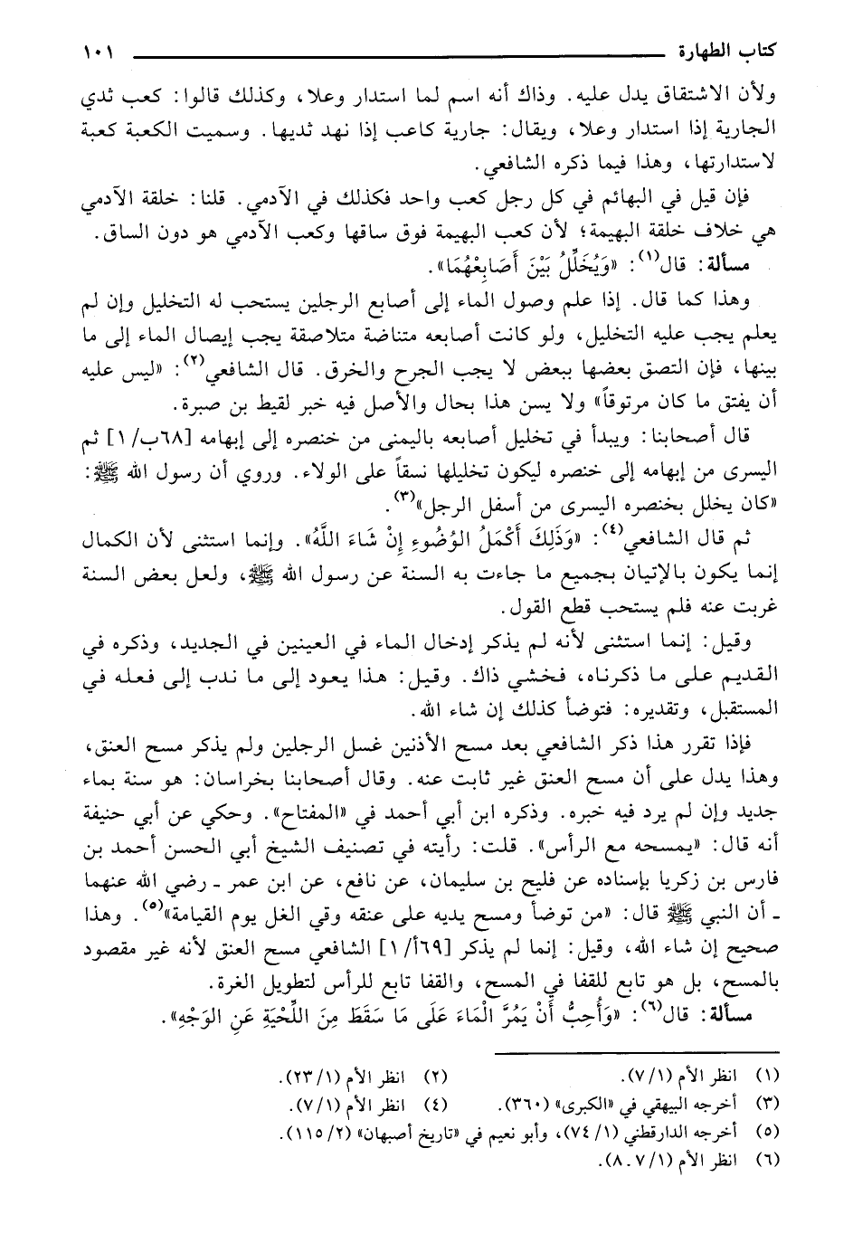 فإذا تقرر هذا ذكر الشافعي بعد مسح الأذنين غسل الرجلين ولم يذكر مسح العنق، وهذا يدل على أن مسح العنق غير ثابت عنه. وقال أصحابنا بخراسان: هو سنة بماء جديد وإن لم يرد فيه خبره. وذكره ابن أبي أحمد في "المفتاح". وحكي عن أبي حنيفة أنه قال: "يمسحه مع الرأس". قلت: رأيته في تصنيف الشيخ أبى الحسن أحمد بن فارس بن زكريا "بإسناده عن فليح بن سليمان، عن نافع، عن ابن عمر - رضي الله عنهما - أن النبي صلى الله عليه وسلم قال: "من توضأ ومسح يديه على عنقه وقي الغل يوم القيامة". وهذا صحيح إن شاء الله، وقيل: إنما لم يذكر [69 ب/ 1] الشافعي مسح العنق لأنه غير مقصود بالمسح، بل هو تابع للقفا في المسح، والقفا تابع للرأس لتطويل الغرة.