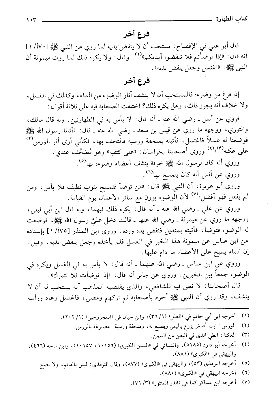 إذا فرغ من وضوءه فالمستحب أن لا ينشف آثار الوضوء من الماء, وكذلك في الغسل, ولا خلاف أنه يجوز ذلك, وهل يكره ذلك؟ اختلفت الصحابة فيه على ثلاثة أقوال: