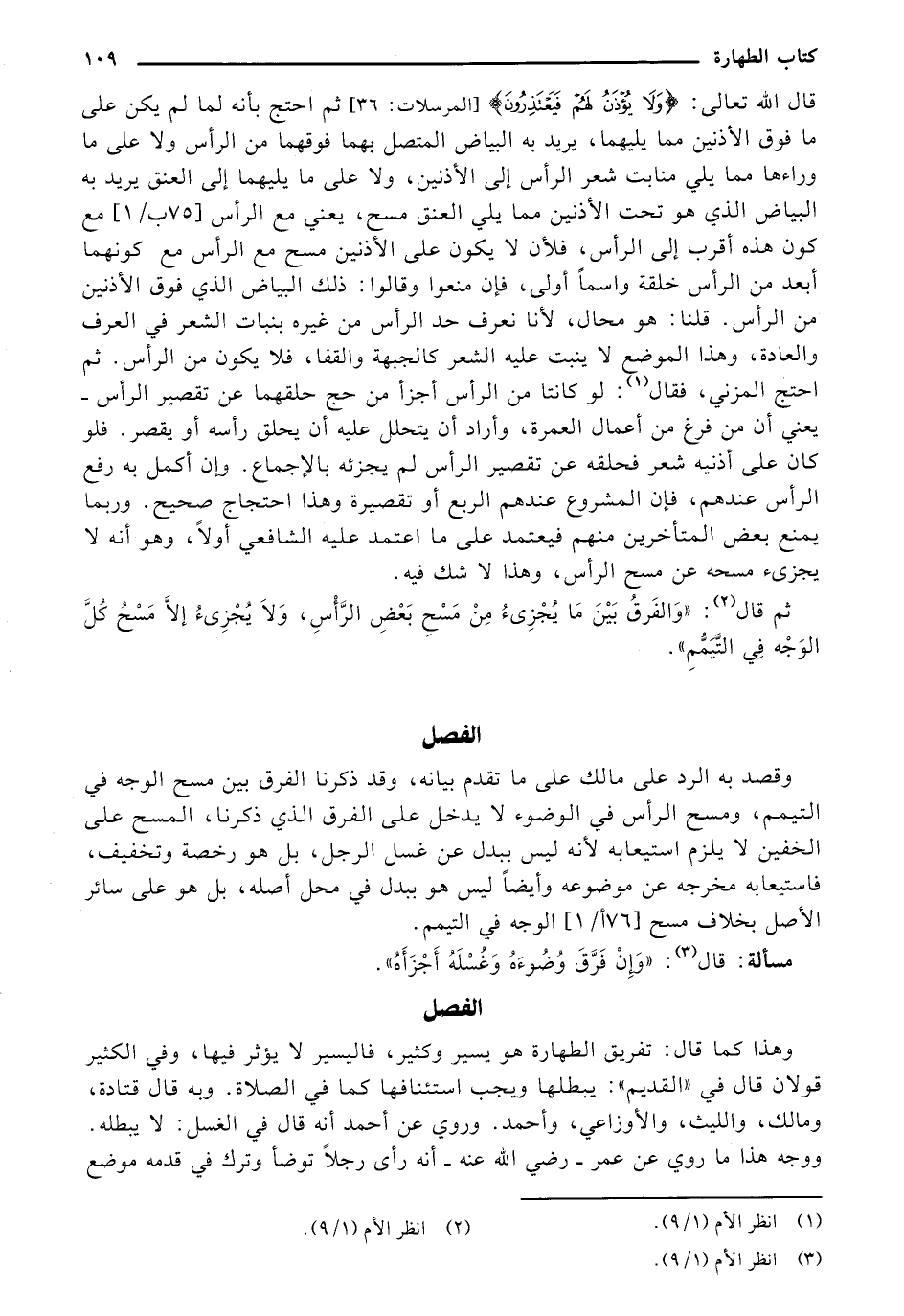 قال الله تعالى: {ولا يُؤْذَنُ لَهُمْ فَيَعْتَذِرُونَ} (المرسلات:36) ثم احتج بأنه لما لم يكن على ما فوق الأذنين مما يليهما, يريد به البياض المتصل بهما فوقهما من الرأس ولا على ما وراءها مما يلي منابت شعر الرأس إلى الأذنين, ولا على ما يليهما إلى العنق يريد به البياض الذي هو تحت الأذنين مما يلي العنق مسح, يعني مع الرأس (76 أ/ 1) مع كون هذه أقرب إلى الرأس, فلأن لا يكون على الأذنين مسح مع كونهما أبعد من الرأس خلقة واسمًا أولى, فإن منعوا وقالوا: ذلك البياض الذي فوق الأذنين من الرأس, قلنا: هو محال, لأنا نعرف حد الرأس من غيره بنبات الشعر في العرف والعادة, وهذا الموضع لا ينبت عليه الشعر كالجبهة والقفا, فلا يكون من الرأس. ثم احتج المزني, لو كانتا من الرأس أجزأ من حج حلقهما عن تقصير الرأس- يعني أن من فرغ من أعمال العمرة, وأراد أن يتحلل عليه أن يحلق رأسه أو يقصر. فلو كان على أذنيه شعر فحلقه عن تقصير الرأس لم يجزئه بالإجماع. وإن أكمل به رفع الرأس عندهم, فإن المشروع عندهم الربع أو تقصيره وهذا احتجاج صحيح. وربما يمنع بعض المتأخرين منهم فيعتمد على ما اعتمد عليه الشافعي أولاً, وهو أنه لا يجزئ مسحه عن مسح الرأس, وهذا لا شك فيه.