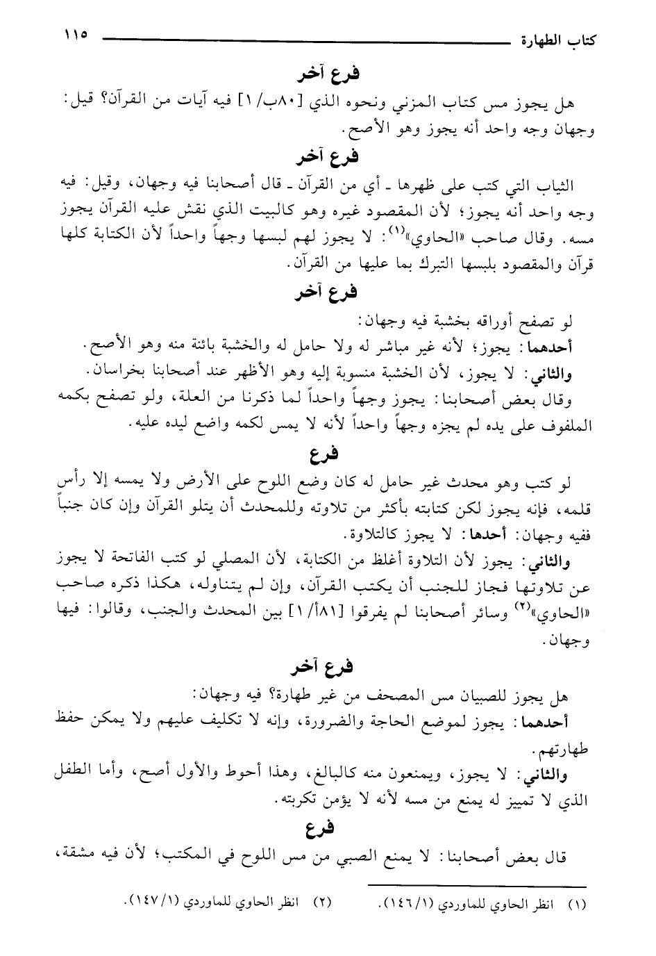 هل يجوز مس كتاب المزني ونحوه الذي (81 أ/ 1) فيه آيات من القرآن؟ قيل: وجهان وجه واحد أنه يجوز وهو الأصح.