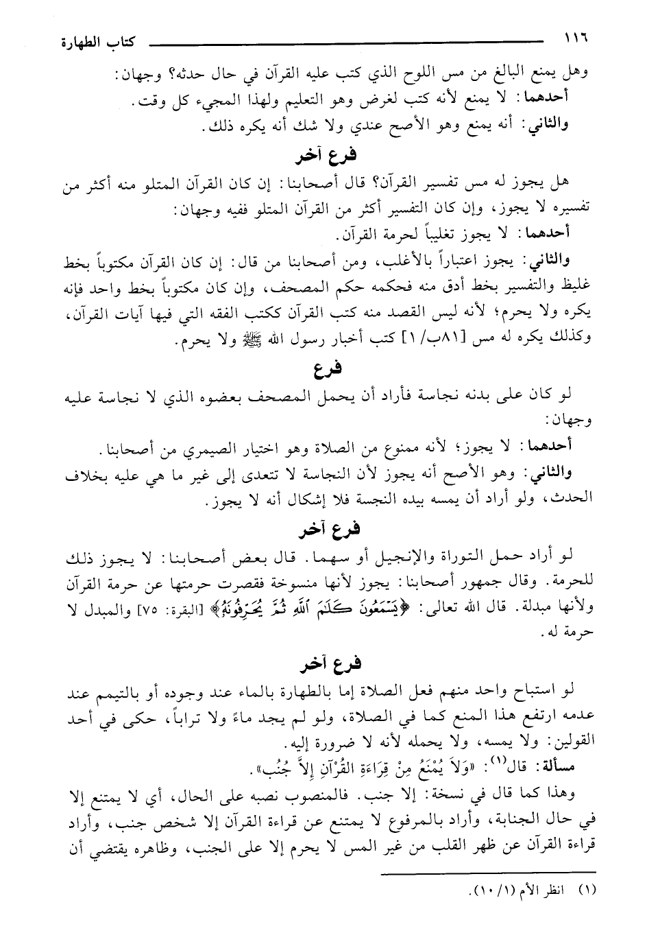 هو يجوز له مس تفسير القرآن؟ قال أصحابنا: إن كان القرآن المتلو منه أكثر من تفسيره لا يجوز, وإن كان التفسير أكثر من القرآن المتلو ففيه وجهان: