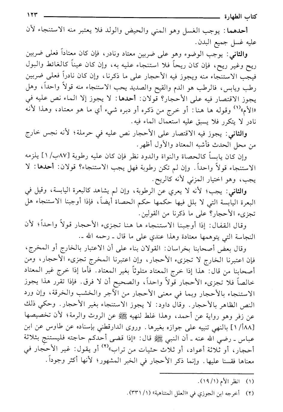 وقال بعض أصحابنا بخراسان: القولان بناء على أن الاعتبار بالخارج أو المخرج. فإن اعتبرنا الخارج لا تجزئ الأحجار، وإن اعتبرنا المخرج تجزئ الأحجار، ومن أصحابنا من قال: هذا إذا خرج المعتاد متلوثًا بغير المعتاد. فآما إذا خرج غير المعتاد خالصًا فلا تجزئ الأحجار قولًا واحدًا، والصحيح أن لا فرق. فإذا تقرر هذا يحرز الاستنجاء بالأحجار وبما في معنى الأحجار من الآجر والخشب والخرقة، وإن ورد النص الظاهر بالأحجار. وقال داود: لا يجوز الاستنجاء بغير الأحجار. وحكي ذلك عن زفر وهو رواية عن أحمد، وهذا غلط لنهيه - صلى الله عليه وسلم - عن الروث والرمةً؛ لأن تخصيصها [88 ب/] بالنهي تنبيه على جوازه بغير ما - وروى الدارقطني بإسناده عن طاووس عن ابن عباس - رضي الله عنه - أن النبي - صلى الله عليه وسلم - قال: "إذا قضى أحدكم حاجته فليستنج بثلاثةً أحجار، أو ثلاثةَ أعواد، أو ثلاث حثيات من تراب"، أو يقول: غير الأحجار في معناها فقسنا عليها. وإنما ذكر الأحجار في الخبر المشهور؛ لأنها أكثر وجودًا.