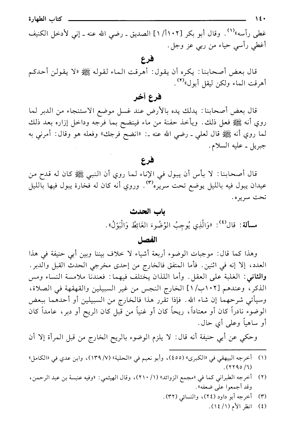وهذا كما قال: موجبات الوضوء أربعة أشياء لا خلاف بيننا وبين أبي حنيفة في هذا العدد، إلا إنه في اثنين. فأما المتفق فالخارج من إحدى مخرجي الحدث القبل والدبر. والثاني: الغلبة على العقل. وأما اللذان يختلف فيهما: فعندنا ملامسة النساء ومس الذكر، عندهم [103/ أ] الخارج النجس من غير السبيلين والقهقهة في الصلاة، وسيأتي شرحهما