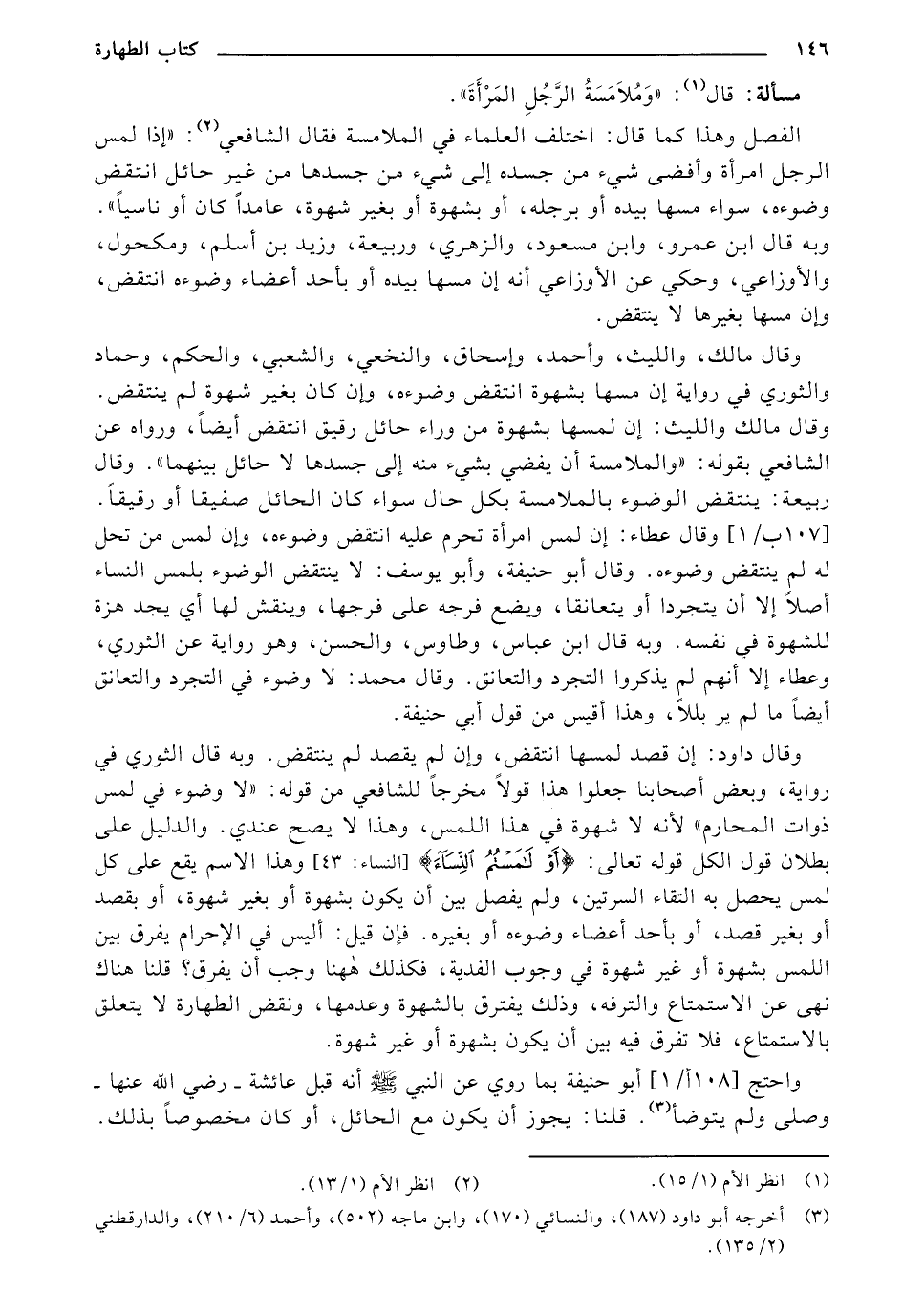 وقال داود: إن قصد لمسها انتقص، وإن لم يقصد لم ينتقص. وبه قال الثوري في رواية، وبعض أصحابنا جعلوا هذا قولًا مخرجًا للشافعي من قوله:" لا وضوء في لمس ذوات المحارم" لأنه لا شهوة في هذا اللمس، وهذا لا يصح عندي. والدليل على بطلان قول الكل وقوله تعالي: {أَوْ لَامَسْتُمُ النِّسَاءَ} [النساء:43] وهذا الاسم يقع على كل لمس يحصل به التقاء السرتين، ولم يفصل بين أن يكون بشهوة أو بغير شهوة، أو بقصد أو بغير قصد، أو بأحد أعضاء وضوءه أو بغيره. فأن قبل: أليس في الإحرام يفرق بين اللمس بشهوة أو غير شهوة في وجوب الفدية، فكذلك ههنا وجب أن يفرق؟ قلنا هناك نهى عن الاستمتاع والترفه، وذلك يفترق بالشهوة وعدمها، ونقض الطهارة لا يتعلق بالاستمتاع، فلا تفرق فيه بين أن يكون بشهوة أو غير شهوة.