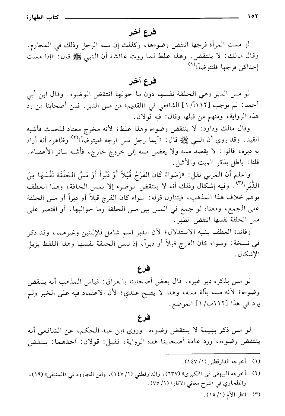 واعلم أن المزني نقل: "وَسَوَاءٌ كَانَ الْفَرْجُ قُبُلًا أَوْدُبُرًا أَوْ مَسُّ الْحَلْقَةِ نَفْسِهَا مِنْ الدُّبُرِ". وفيه أشكال وذلك انه لا ينتقض الوضوء إلا بمس الحافة، وهذا العطف يوهم خلاف هذا المذهب، فيتناول قوله" سواء كان الفرح قبلًا أو دبرًا أو مس الحلقة على الجمع، ومعناه لو جمع في المس بين مس مس الحلقة وما حواليها، أو اقتصر على مس الحلقة نفسها انتقص الطهر.