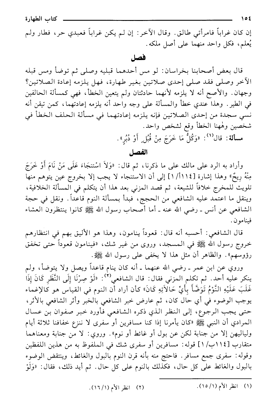 وأراد به الرد على مالك على ما ذكرنا، ثم قال:" وَلَا اسْتنجَاءَ عَلَى مَنْ نَامَ أَوْ خَرَجَ مِنْهُ رِيحٌ" وهذا إشارة [114 ب/ 1] إلى أن الاستنجاء لا يجب إلا بخروج عين يتوهم منها تلويث للمخرج خلافًا للشيعة، ثم قصد المزني بعد هذا أن يتكلم في المسألة الخلافية، وينقل ما اعتمد عليه الشافعي من الحجج، فبدأ بمسألة النوم قاعدًا. ونقل في حجة الشافعي عن أنس- رضي الله عنه- أما أصحاب رسول الله (صلي الله عليه وسلم) كانوا ينتظرون العشاء فينامون.