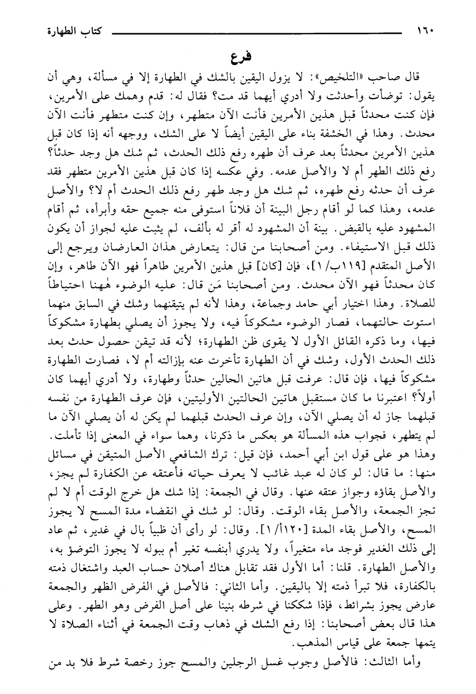 لم يتطهر، فجواب هذه المسألة هو بعكس ما ذكرنا، وهما سواء في المعنى إذا تأملت. وهذا هو على قول ابن أبي أحمد، فإن قيل: ترك الشافعي الأصل المتيقن في مسائل منها: ما قال: لو كان له عبد غائب لا يعرف حياته فأعتقه عن الكفارة لم يجز، والأمل بقاؤه وجواز عتقه عنها. ونال في الجمعة: إذا شك هل خرج الوقت أم لا لم تجز الجمعة، والأصل بقاء الوقت. وقال: لو شك في انضاء مدة المسح لا يجوز المسح، والأصل بقاء المدة [120 ب/ 1]. وقال: لو رأى أن ظبيًا بال في غدير، ثم عاد إلى ذلك الغدير فوجد ماء متغيرًا، ولا يدري أبنفسه تغير أم ببوله لا يجوز التوضيء به، والأصل الطهارة. قلنا: أما الأول فقد تقابل هناك أصلان حساب العبد واشتغال ذمته بالكفارة، فلا تبرأ ذمته إلا باليقين. وأما الثاني: فالأصل في الفرض الظهر والجمعة عارض يجوز بشرائط، فإذا شككنا في شرطه بنينا على أصل الفرض وهو الطهر. وعلى هذا قال يعض أصحابنا: إذا رفع الشك في ذهاب وقت الجمعة في أثناء الصلاة لا يتمها جمعة على قياس المذهب.