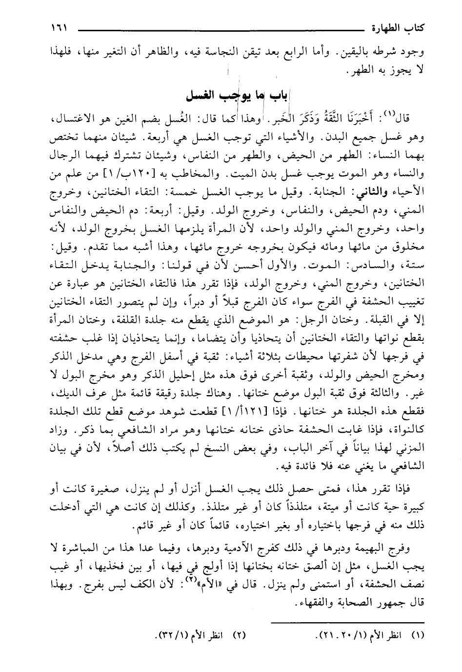 قال: أَخْيَرَنَا الْثَّقَةُ وَذَكَرَ الْخَبر. وهذا كما قال: الغُسل بضم الغين هو الاغتسال، وهو غسل جميع البدن. والأشياء التي توجبا الغسل هي أربعة. شيئان منهما تختص بهما النساء: الطهر من الحيض، والطهر من النفاس، وشيئان تشترك فيهما الرجال والنساء وهو الموت يوجب غسل بدن الميت. والمخاطب به [121 أ/ 1] من علم من الأحياء والثاني: الجنابة. وقيل ما يوجب الغسل خمسة: التقاء الختانين، وخروج المني، ودم الحيض، والنفاس، وخروج الولد. وقيل: أربعة: دم الحيض والنفاس واحد، وخروج المني والولد واحد، لأن المرأة يلزمها الغسل بخروج الولد، لأنه مخلوق من مائها ومائه فيكون بخروجه خروج مائها، وهذا أشبه مما تقدم. وقيل: ستة، والسادس: الموت. والأول أحسن لأن في قولنا: والجنابة يدخل التقاء الختانين، وخروج المني، وخروج الولد، فإذا تقرر هذا فالتقاء الختانين هو عبارة عن تغييب الحشفة في الفرج سواء كان الفرج قبلًا أو دبرًا، وإذا لم يتصور التقاء الختانين إلا في القبلة. وختان الرجل: هو الموضع الذي يقطع منه جلدة القلقة، وختان المرأة يقطع نواتها والتقاء الختانين أن يتحاذيا وأن يتضاما، وإنما يتحاذيان إذا غلب حشفته في فرجها لأن شفرتها محيطات بثلاثة أشياء: ثقبة في أسفل الفرج وهي مدخل الذكر