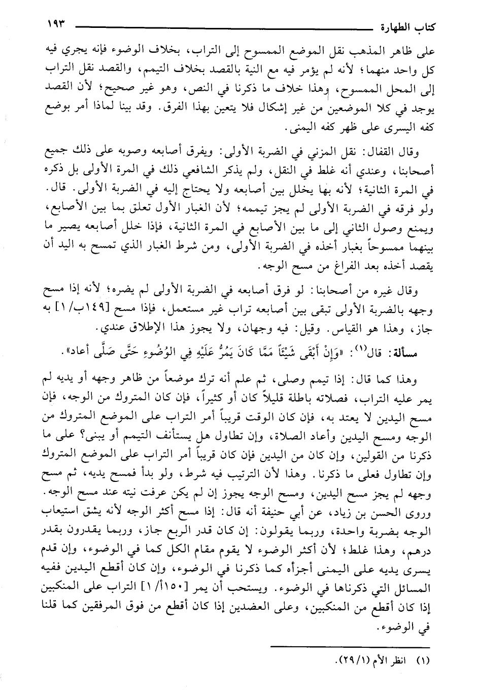 على ظاهر المذهب نقل الموضع الممسوح إلى التراب، بخلاف الوضوء فإنه يجري فيه كل واحد منهما؛ لأنه لم يؤمر فيه مع النية بالقصد بخلاف التيمم، والقصد نقل التراب إلى المحل الممسوح، وهذا خلاف ما ذكرنا في النص، وهو غير صحيح؛ لأن القصد يوجد في كلا الموضعين من غير إشكال فلا يتعين بهذا الفرق. وقد بينا لماذا أمر بوضع كفه اليسرى على ظهر كفه اليمنى.