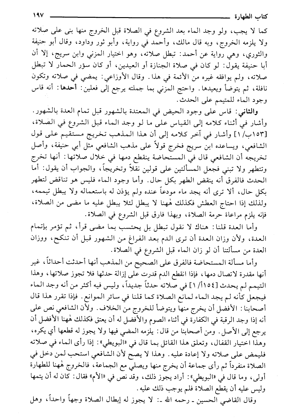 والثاني: قاس على وجود الحيض في المعتدة بالشهور قبل تمام العدة بالشهور. وأشار في أثناء كلامه إلى القياس على ما لو وجد الماء قبل الشروع في الصلاة, [154 أ/1] وأشار في آخر كلامه إلى أن هذا المذهب تخريج مستقيم على قول الشافعي, ويساعده ابن سريج فخرج قولاً على مذهب الشافعي مثل أبي حنيفة, وأصل تخريجه أن الشافعي قال في المستحاضة ينقطع دمها في خلال صلاتها: أنها تخرج وتتطهر ولا تبنى فجعل المسألتين على قولين نقلاً وتخريجًا, والجواب أن يقول: أما الحدث فالفرق أنه ينقض الطهر بكل حال. وأما وجود الماء فليس هو تناقض لتطهر بكل حال, ألا ترى أنه يجد ماء مودعًا عنده ولم يؤذن له باستعماله ولا يبطل تيممه, ولذلك إذا احتاج العطش فكذلك هاهنا لا يبطل لئلا يبطل عليه ما مضى من الصلاة, فإنه يلزم مراعاة حرمة الصلاة, وبهذا فارق قبل الشروع في الصلاة.