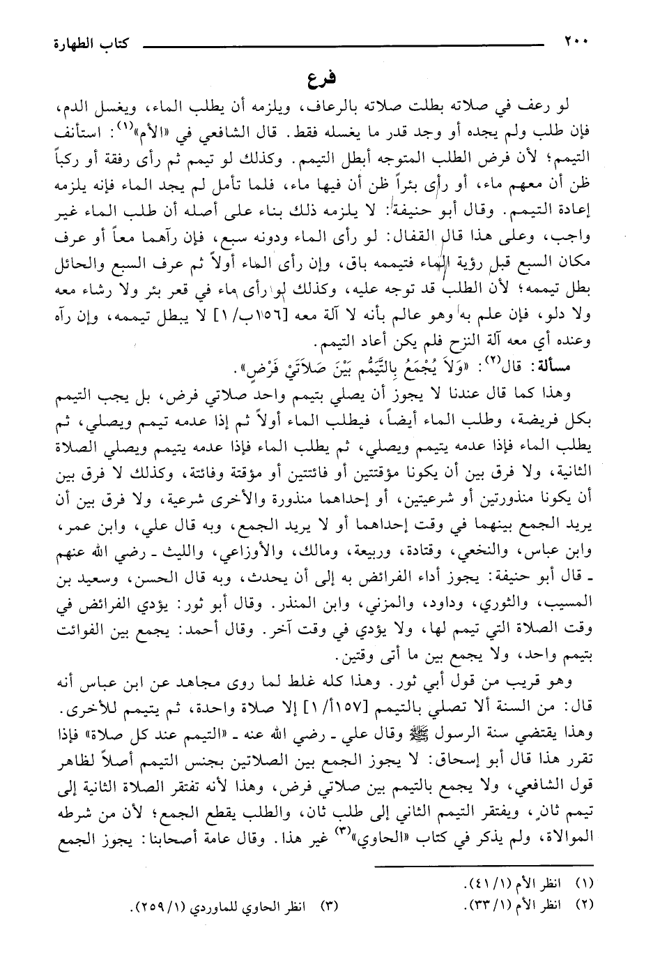 الماء فإذا عدمه يتيمم ويصلي الصلاة الثانية, ولا فرق بين أن يكونا مؤقتتين أو فائتتين أو مؤقتة وفاتنة, وكذلك لا فرق بين أن يكونا منذورتين أو شرعيتين, أو إحداهما منذورة والأخرى شرعية, ولا فرق بين أن يريد الجمع بينهما في وقت إحداهما أو لا يريد الجمع, وبه قال علي, وابن عمر, وابن عباس, والنخعي, وقتادة , وربيعة, ومالك, والأوزاعي, والليث- رضي الله عنهم- قال أبو حنيفة: يجوز أداء الفرائض به إلى أن يحدث, وبه قال الحسن, وسعيد بن المسيب, والثوري, وداود, والمزني, وابن المنذر. وقال أبو ثور: يؤدي الفرائض في وقت الصلاة التي تيمم لها, ولا يؤدي في وقت آخر. وقال أحمد: يجمع بين الفوائت بتيمم واحد, ولا يجمع بين ما أتى وقتين.